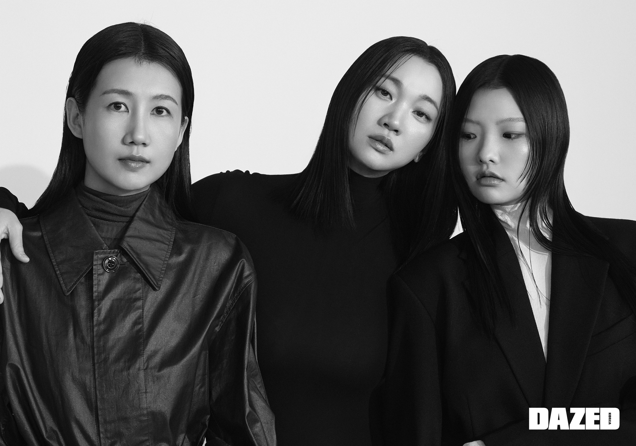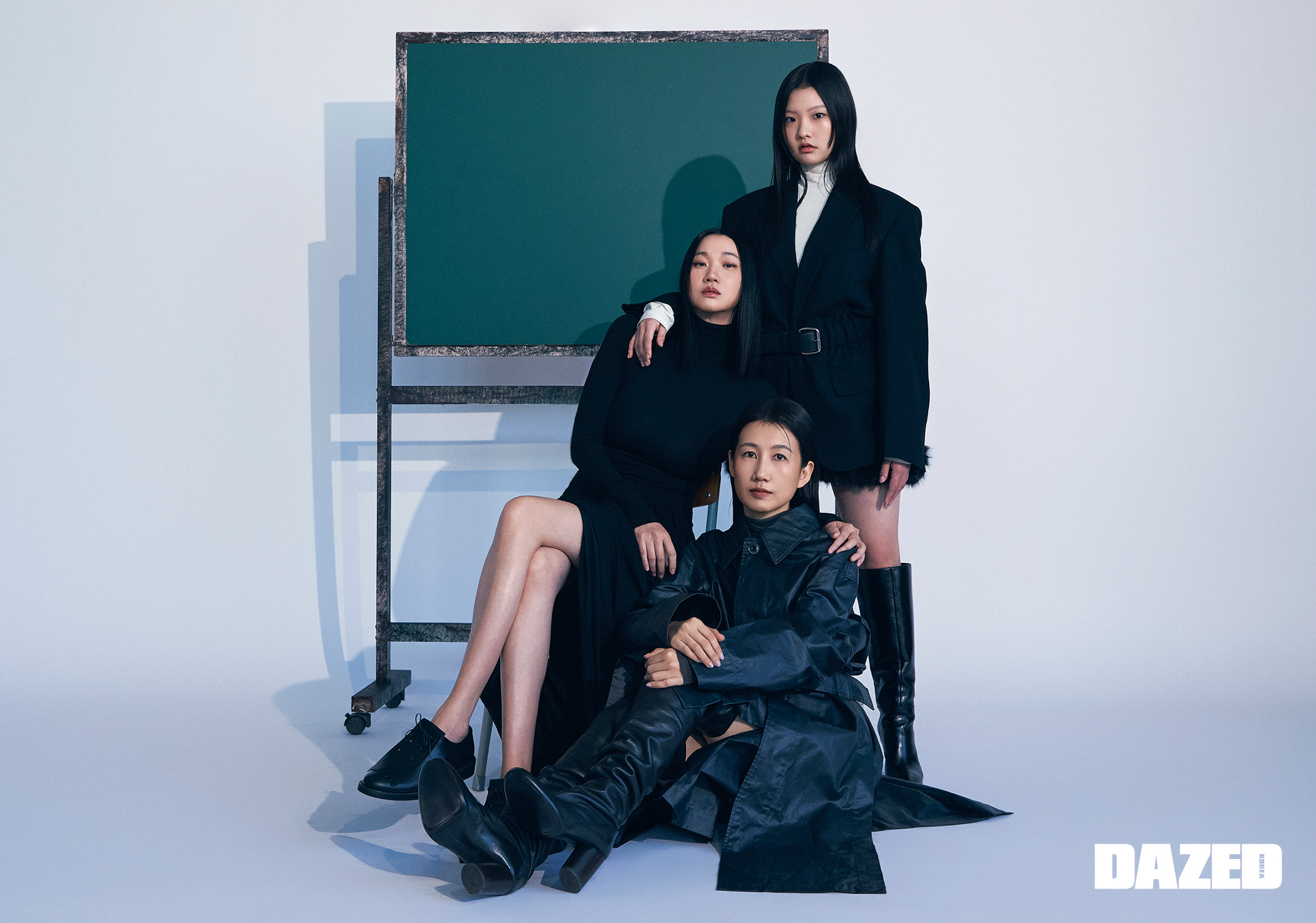 윤주가 입은 튤립 스커트 터틀넥 드레스는 페라가모(Ferragamo), 로퍼는 막스마라(Max Mara). 현정이 입은 슬릿 디테일의 벨티드 레인 코트와 터틀넥 톱, 스트랩 스커트, 레더 부츠는 모두 르메르(Lemaire). 수인이 입은 블랙 블레이저는 알렉산더왕(alexanderwang), 스커트는 페라가모(Ferragamo), 부츠는 모스키노(Moschino), 스커트 밑단을 장식한 퍼 벨트는 웰던(We11done), 터틀넥 톱은 에디터의 것.