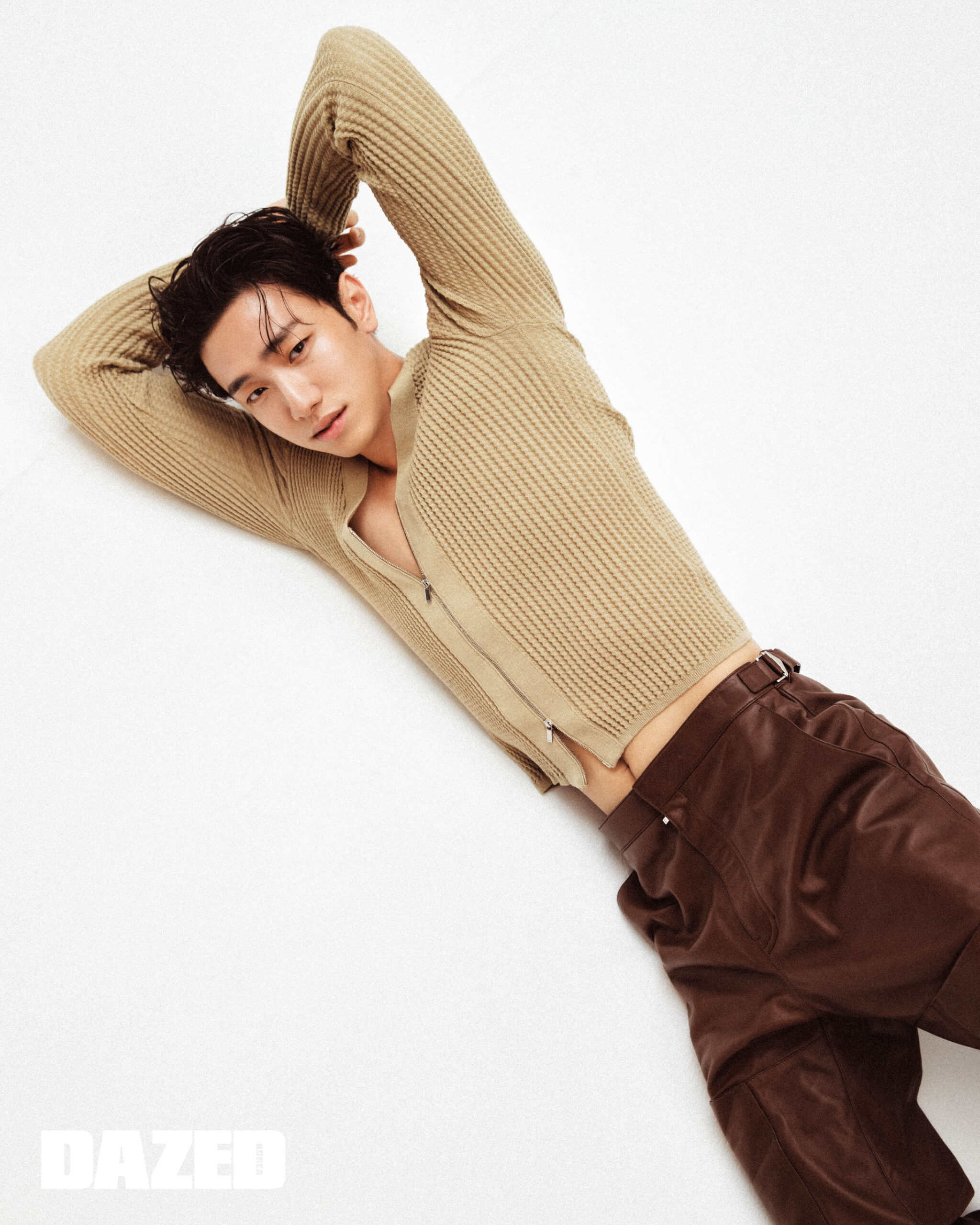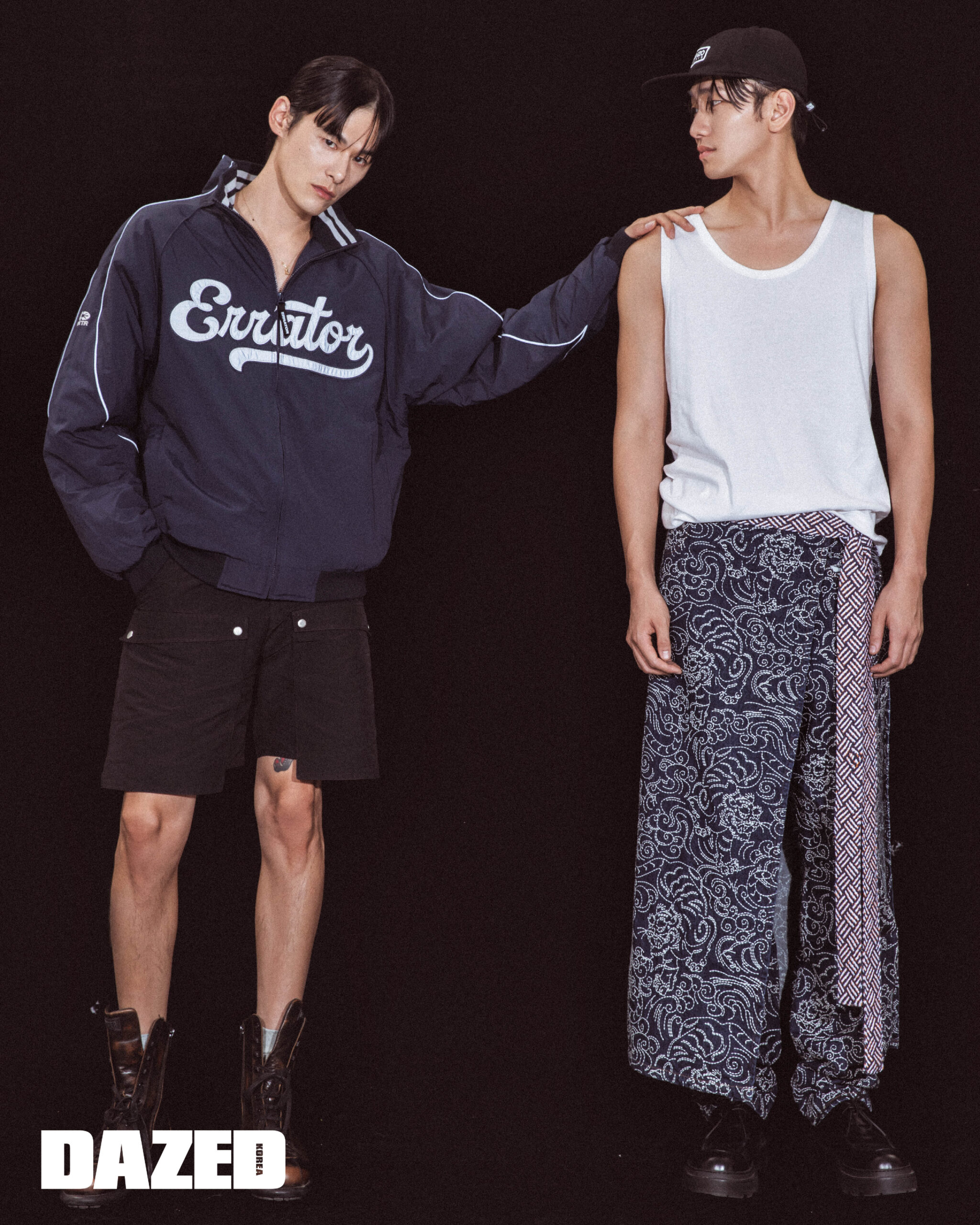 윤수가 입은 프린트 톱과 셔츠, 데님 팬츠, 부츠는 모두 디젤(Diesel), 브리프는 스타일리스트의 것. 현우가 입은 브라운 바시티 재킷은 스모크라이즈(Smoke Rise), 팬츠는 프라이빗네이버스(Private Neighbors), 슈즈는 캠퍼(Camper), 삭스는 에디터의 것.