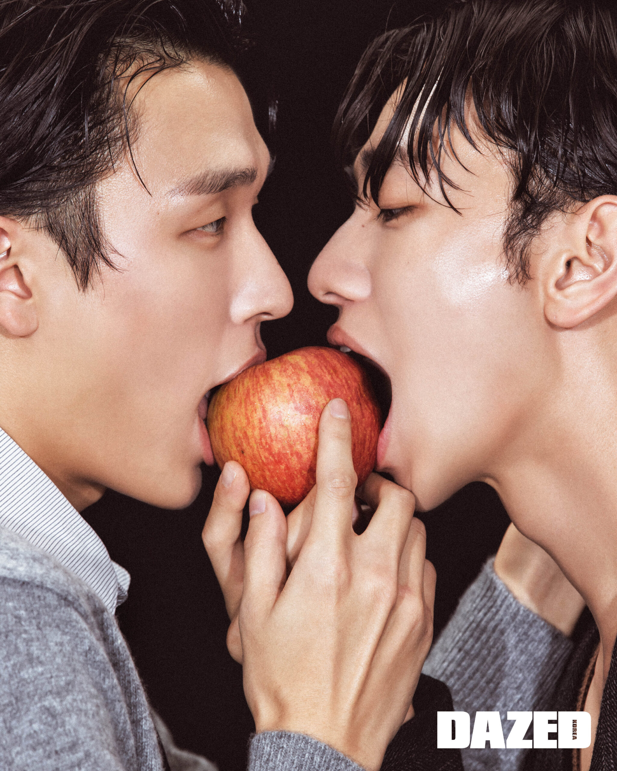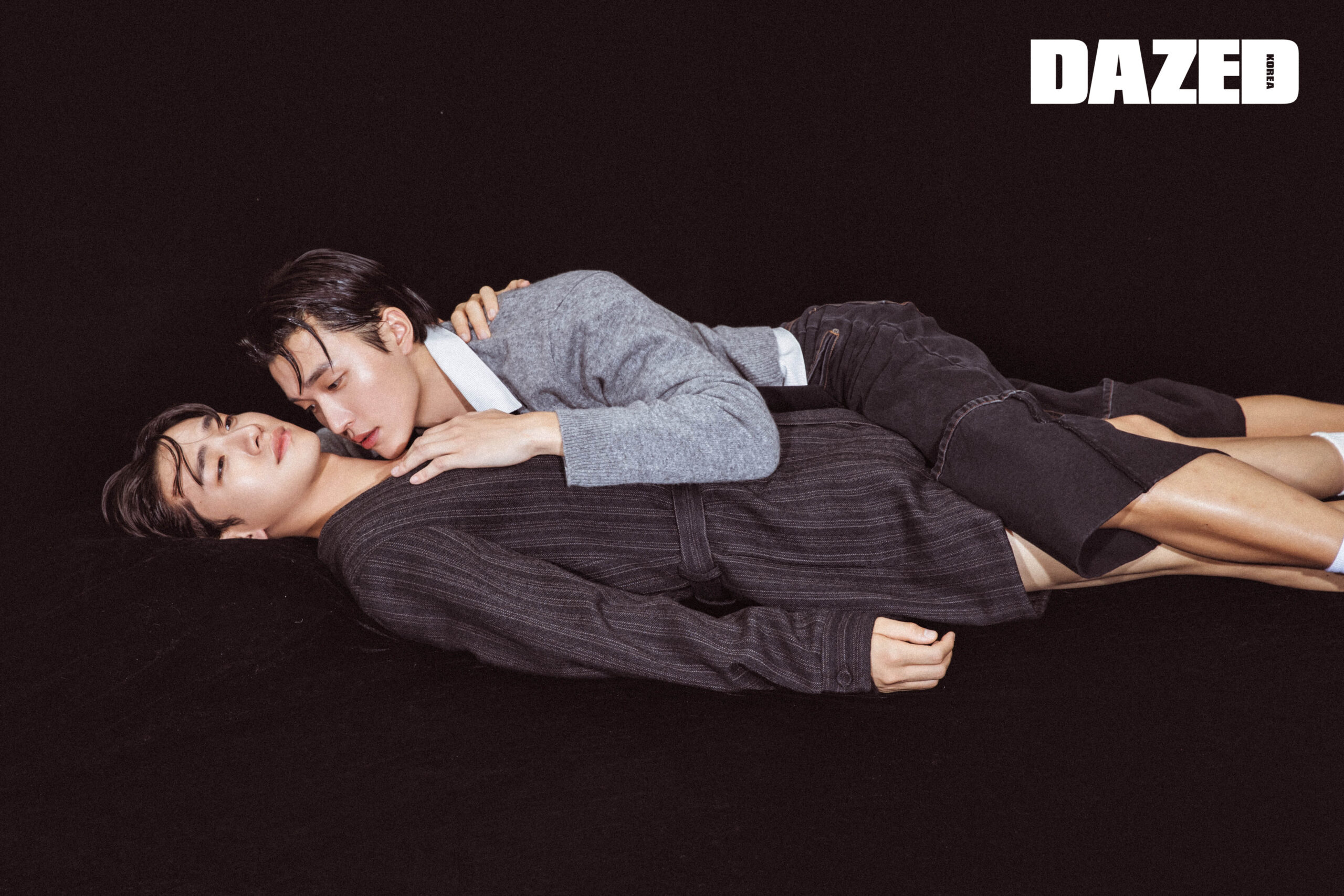 윤수가 입은 그레이 점프슈트는 디올 맨(Dior Men). 호은이 입은 그레이 니트와 스트라이프 셔츠는 아이엘(Aieul), 하프 팬츠는 푸시 버튼(PushBUTTON), 삭스는 에디터의 것.