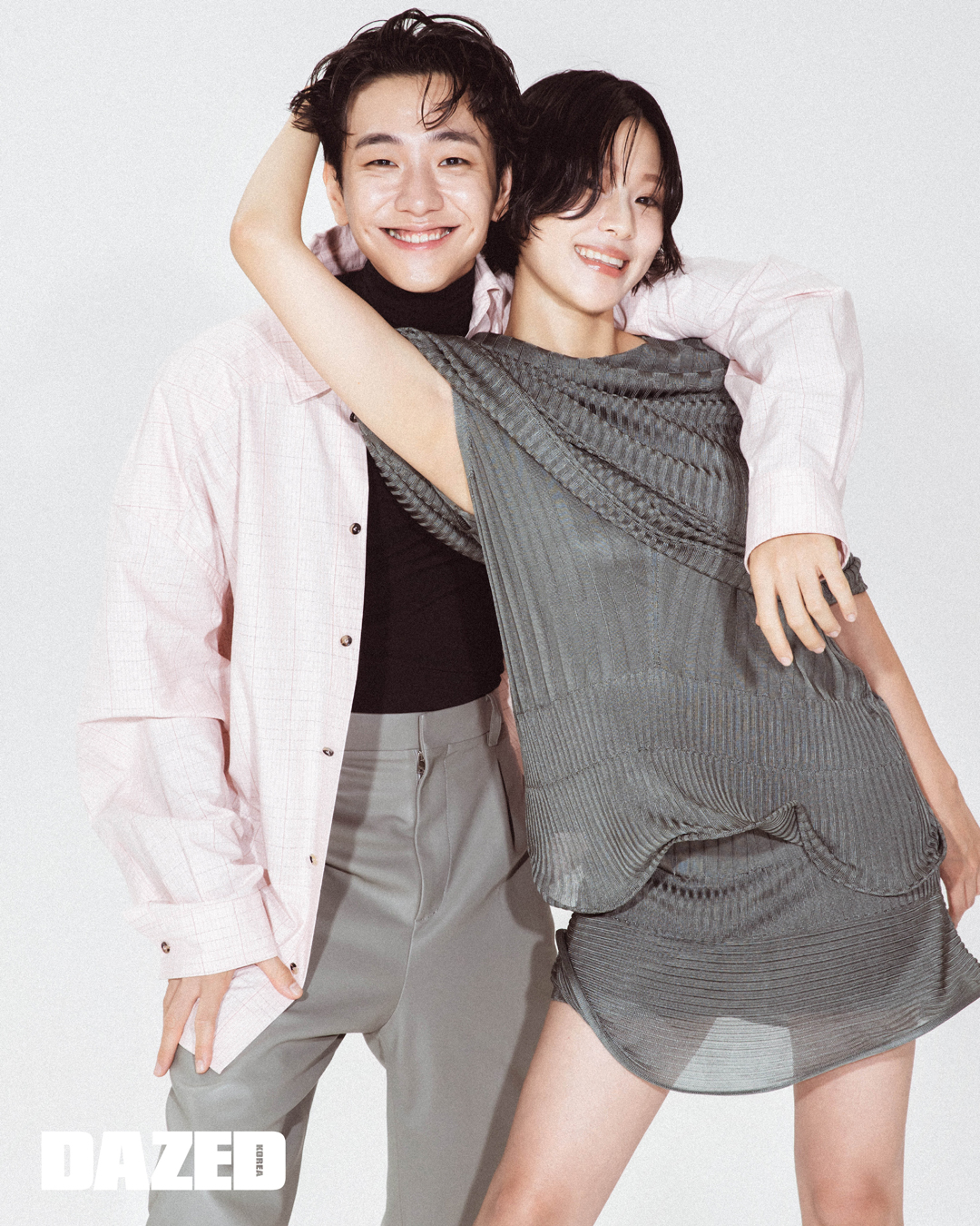 호은이 입은 그레이 니트와 스트라이프 셔츠는 아이엘(Aieul). 윤수가 입은 그레이 점프슈트와 브라운 니트 톱은 디올 맨(Dior Men).