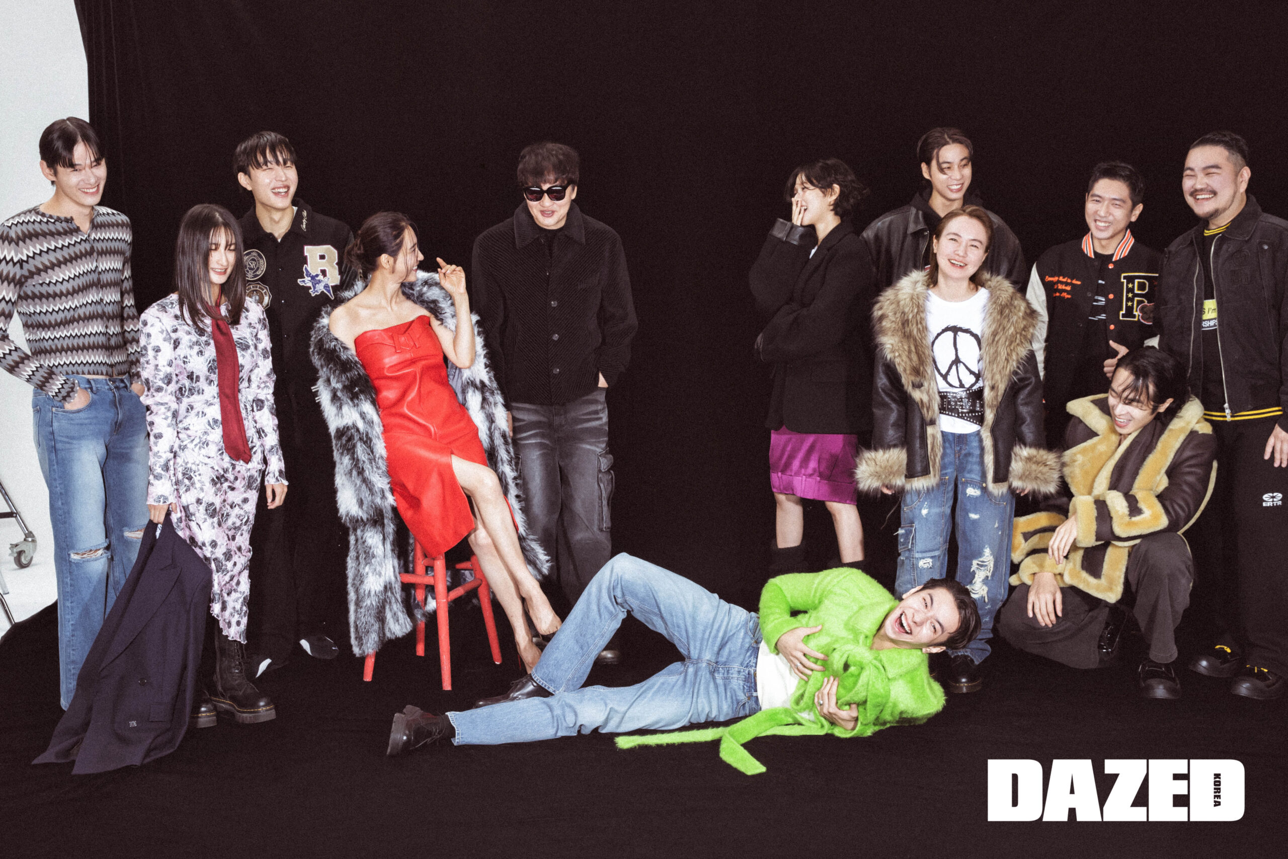 원중이 입은 톱과 팬츠는 레이블리스(Labeless). 수인이 입은 패턴 드레스는 가니(Ganni), 슈즈는 닥터마틴(Dr. Martens), 타이와 손에 들고 있는 재킷은 로에베(Loewe). 호은이 입은 바시티 재킷과 팬츠는 스모크라이즈(Smoke Rise), 슈즈는 푸마(Puma). 현경이 입은 퍼 코트는 가니(Ganni), 레드 레더 튜브톱 드레스는 웰던(We11done), 슈즈는 에디터의 것. 진호가 입은 재킷은 아이엘(Aieul), 톱은 세이모우(Ceimou), 워싱 데님 팬츠는 톰스벌스데이(Tom’s Birthday), 슈즈는 캠퍼(Camper). 윤수가 입은 옐로 그린 보 셔츠와 데님 팬츠는 로에베(Loewe), 아이보리 슬리브리스 톱은 렉토(Recto), 슈즈는 토즈(Tod’s). 수경이 입은 블랙 재킷과 새틴 스커트, 슈즈는 모두 웰던(We11done), 티셔츠는 에디터의 것. 현우가 입은 레더 재킷은 톰스벌스데이(Tom’s Birthday), 후드는 썬러브(Sunlove). 지영이 입은 퍼 재킷은 오픈와이와이(Open YY), 데님 팬츠는 가니(Ganni), 슈즈는 닥터마틴(Dr. Martens), 티셔츠와 벨트는 에디터의 것. 태겸이 입은 바시티 재킷은 스모크라이즈(Smoke Rise), 톱은 톰스벌스데이(Tom’s Birthday). 이 입은 퍼 디테일 레더 재킷과 팬츠는 뉴인(Neu_in), 슈즈는 오니츠카타이거(Onitsuka Tiger). 상영이 입은 데님 재킷은 플라스틱 프로덕트(Plastic Product), 톱은 하이타이드 프랭키(Hightide Frankie), 스웨트팬츠는 썬러브(Sunlove), 슈즈는 캠퍼(Camper).