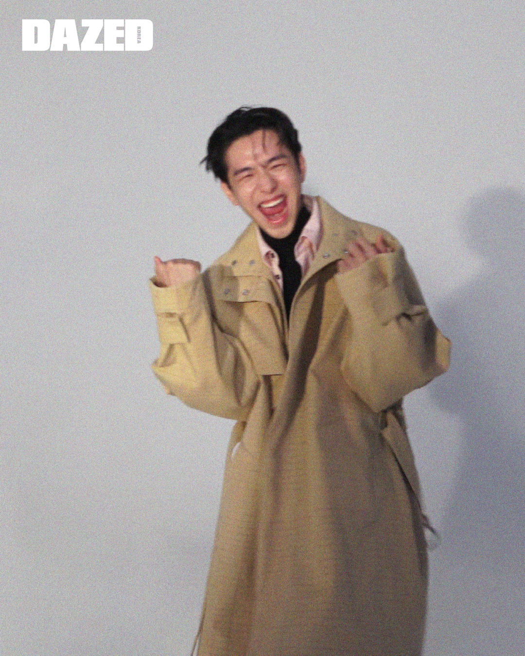 윤수가 입은 베이지 코트와 핑크 셔츠, 블랙 터틀넥은 모두 보테가 베네타(Bottega Veneta). 이 입은 올리브 그린 모노그램 블루종과 니트는 페라가모(Ferragamo).