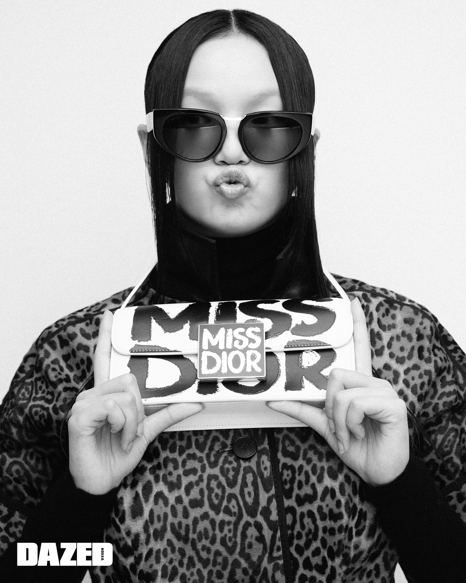 레오퍼드 재킷과 블랙 터틀넥, 이어링, 화이트 카프레더 미스 디올 백은 모두 디올(Dior), 아이웨어는 막스마라(Max Mara).