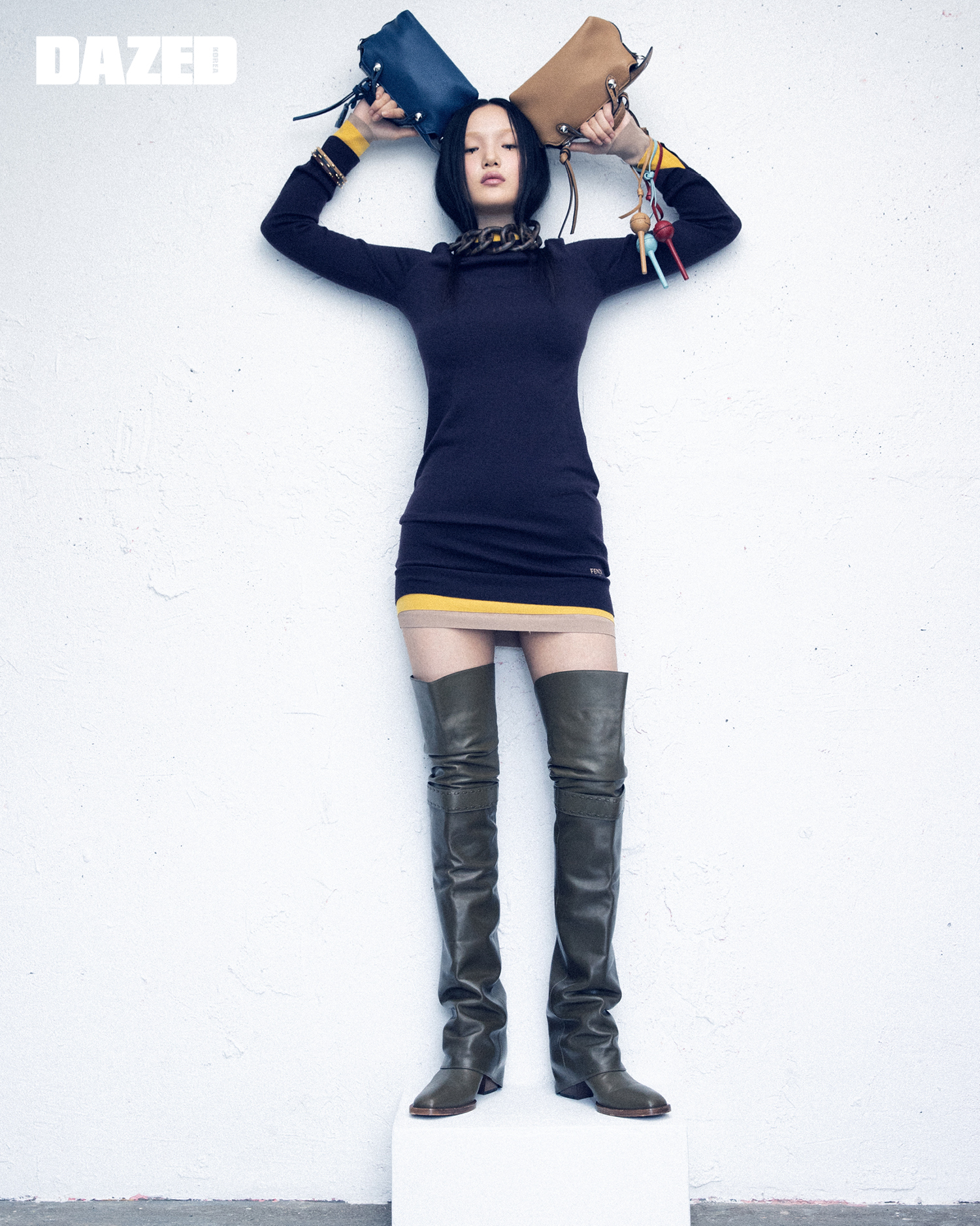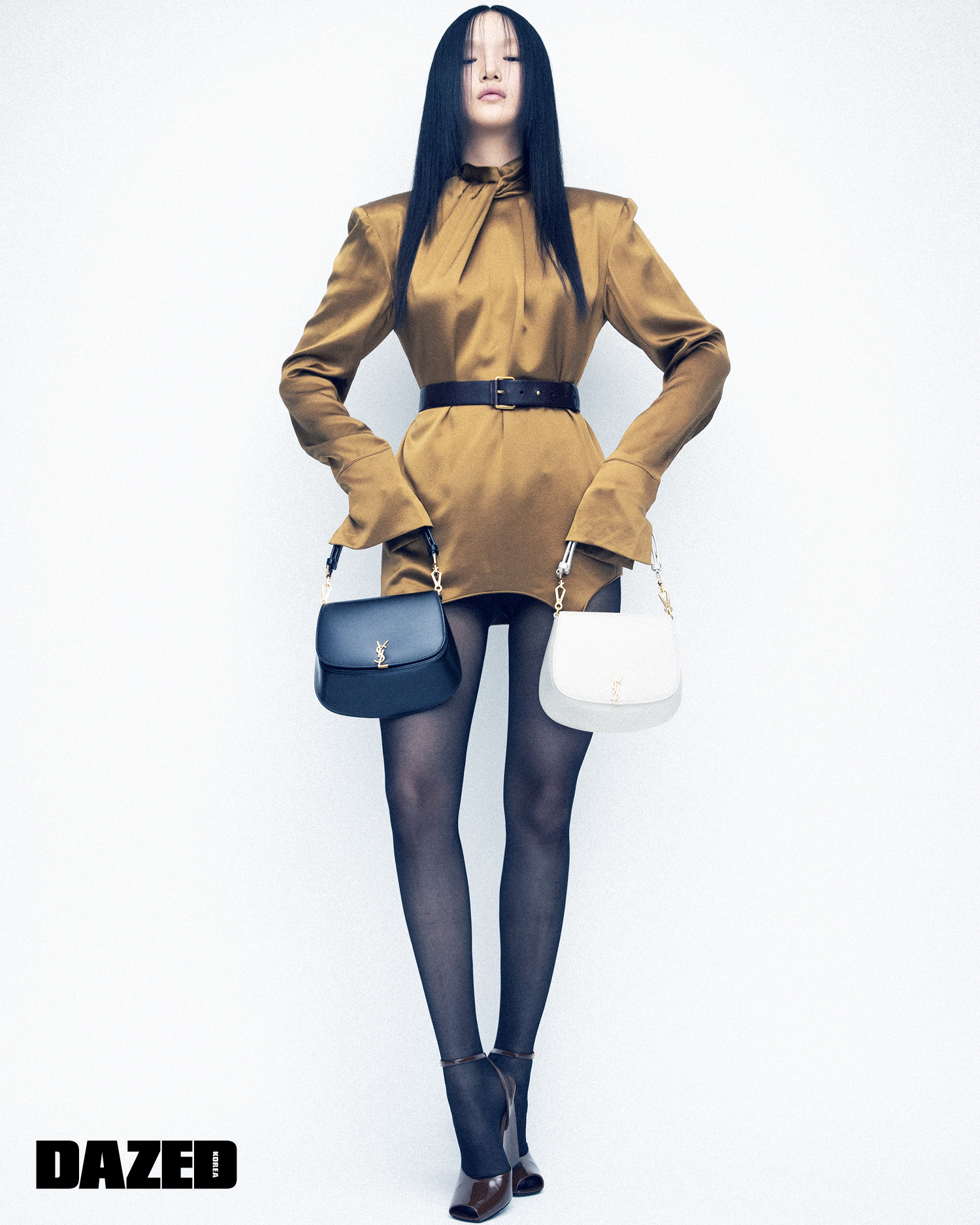 니티드 보디슈트는 드리스 반 노튼(Dries Van Noten), 메리제인 슈즈는 메종 마르지엘라(Maison Margiela), 이어링은 질샌더(Jil Sander), 스터드 디테일의 블랙 레더 톱 핸들 백은 케이트(Khaite), 타이츠는 에디터의 것.