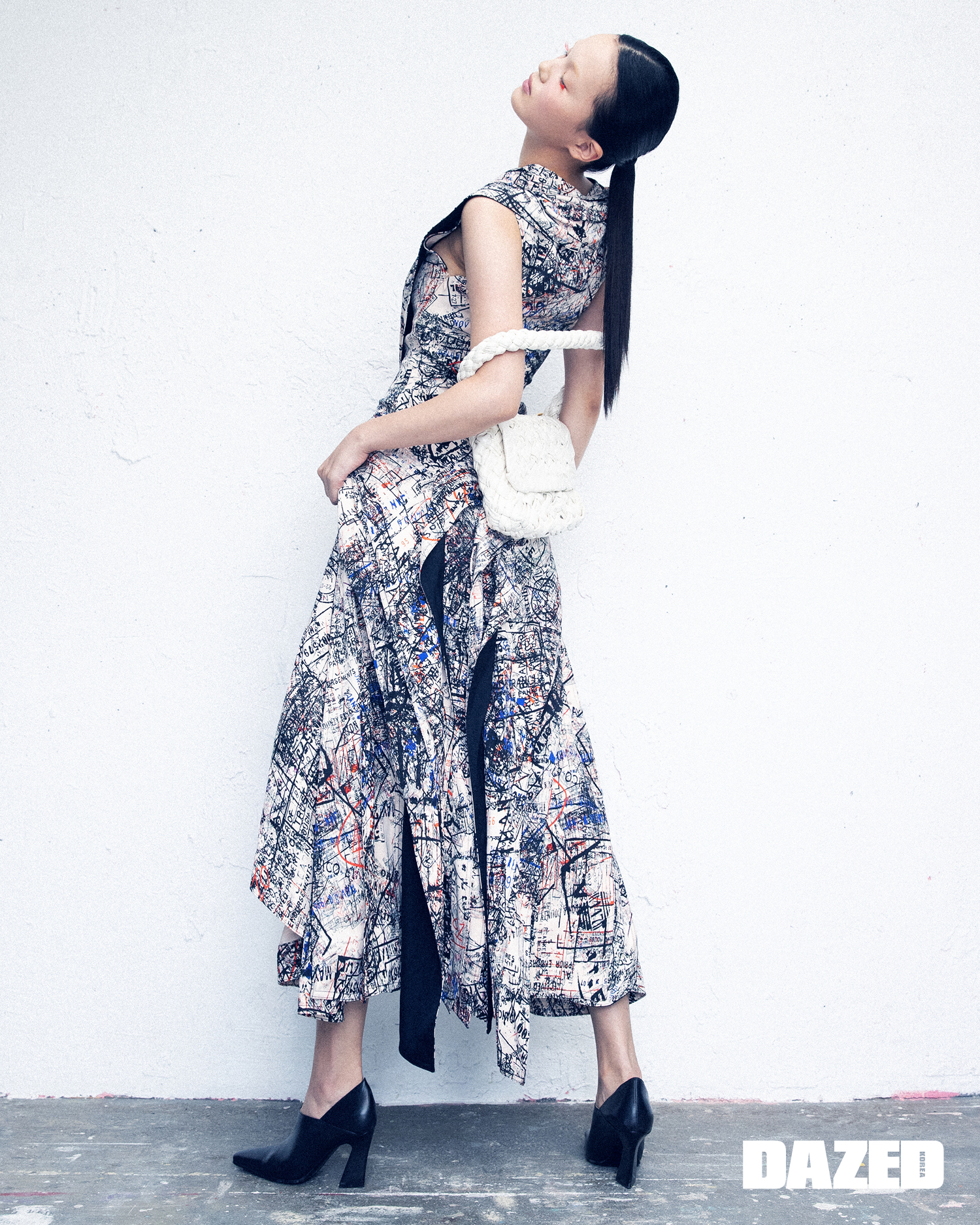 플루이드 비스코스 메모리 프린트 드레스와 루이스 펌프스 힐, 칼리메로 씨타 백은 모두 보테가 베네타(Bottega Veneta).