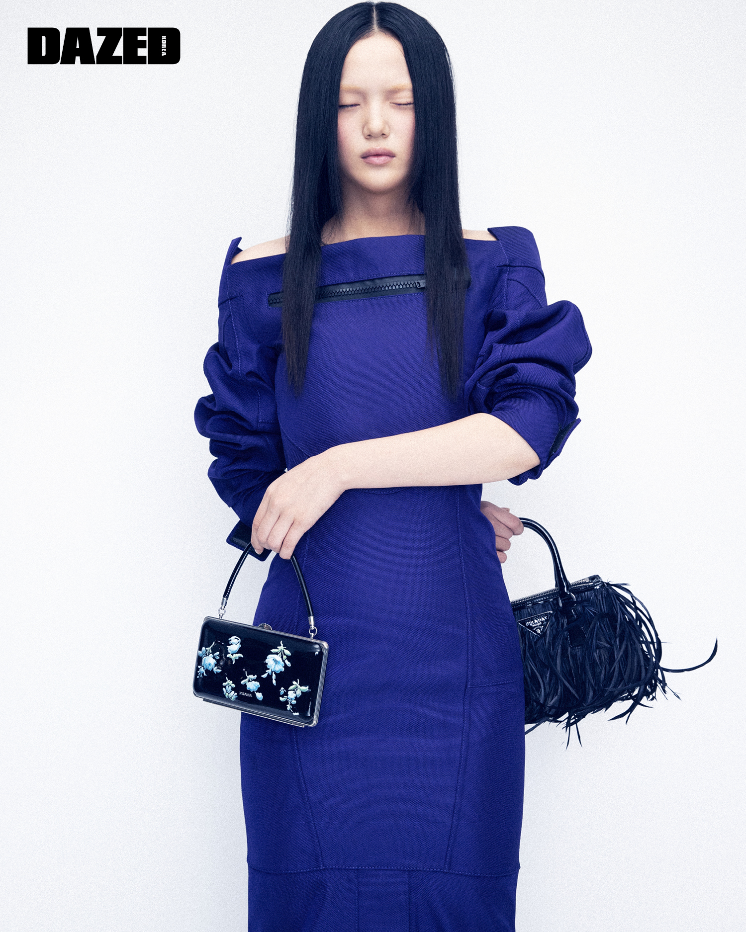 테크니컬 지퍼 디테일의 바이올렛 드레스와 블랙 갤러리아 백, 미노디에르 백은 모두 프라다(Prada).