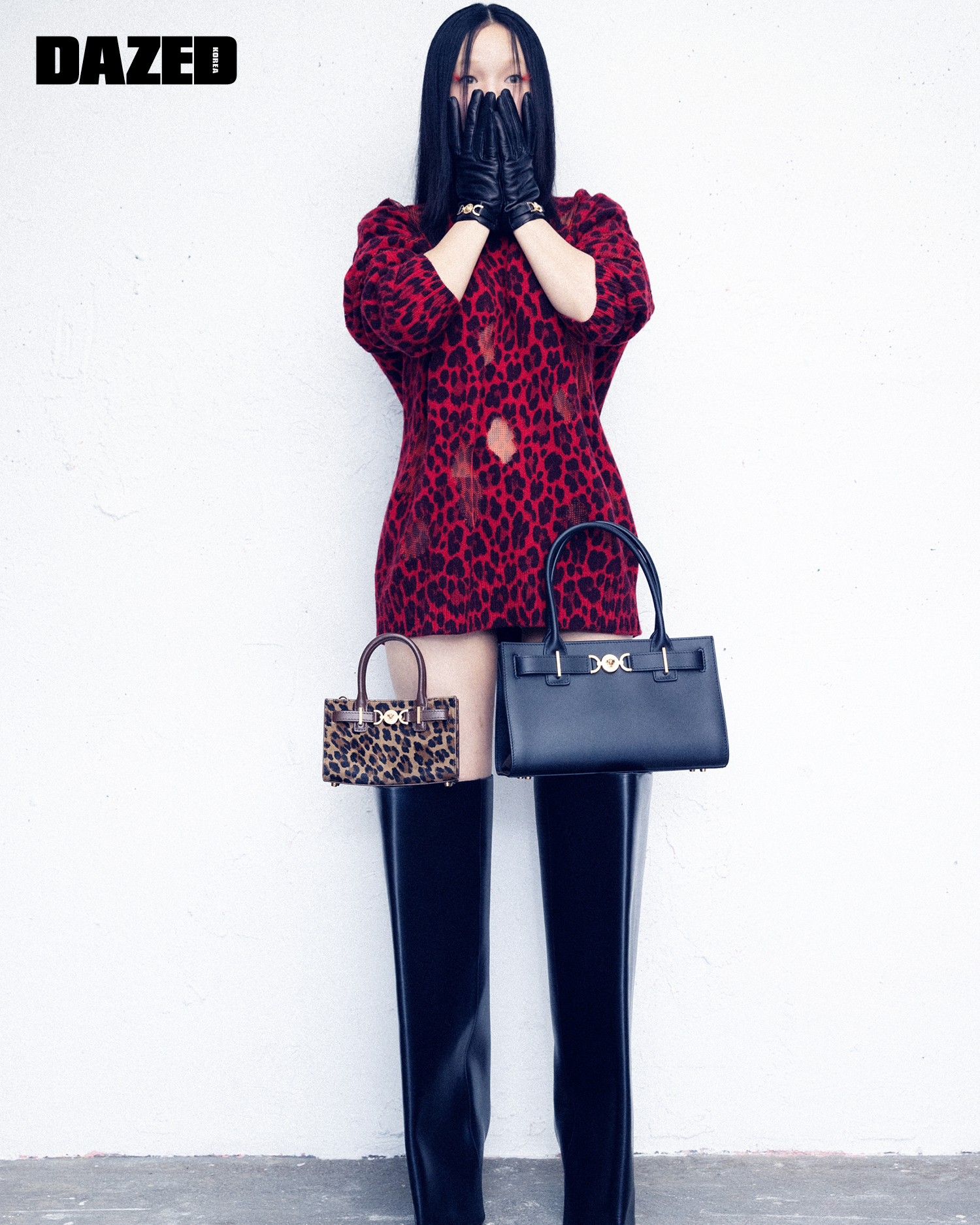 레드 레오퍼드 인타르시아 오버사이즈 점퍼와 레더 글러브, 레오퍼드 메두사 95 스몰 핸드백, 블랙 메두사 95 토트백은 모두 베르사체(Versace), 뉴 웨이더 110mm 부츠는 발렌시아가(Balenciaga).