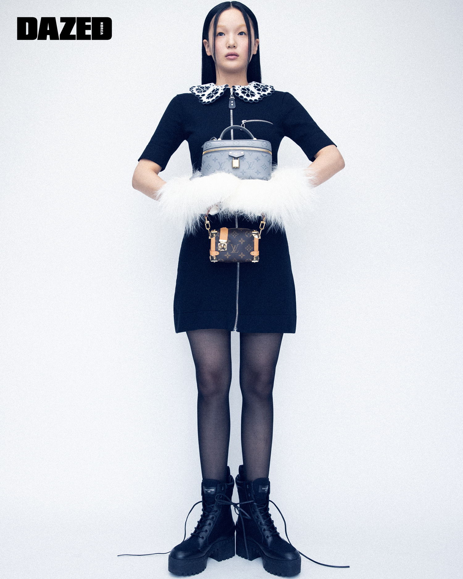브로더리 칼라 집업 니트 드레스와 데저트 부츠, 화이트 퍼 미튼 글러브, 베니티 체인 파우치 백, 피코 사이드 트렁크 백은 모두 루이 비통(Louis Vuitton), 타이츠는 에디터의 것.