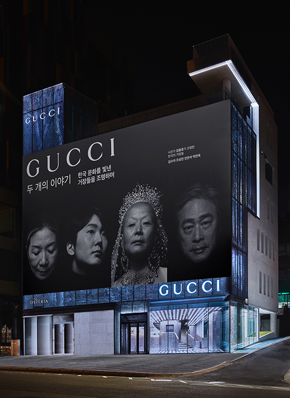 예술과 패션이 만나는 순간! 구찌가 사진전 를 통해 한국 예술 거장들을 새로운 시선으로 담아냈다. 10월 29일까지 파운드리 서울에서 열리는 사진전은 한국 문화에 경의를 표하는 ‘구찌 문화의 달Gucci Cultural Month’ 프로젝트의 일환으로 기획됐다. 사진가 김용호는 자신만의 시선으로 개념 미술가 김수자, 영화감독 박찬욱, 현대 무용가 안은미, 피아니스트 조성진 등 한국 예술을 대표하는 거장들을 탐구한다. 구찌는 이번 프로젝트를 통해 한국 예술계의 거장들이 작품을 통해 어떻게 세상과 소통하고 그들의 정체성을 표현하는지 조명했다. 또한, 전시의 오프닝에는 박규영, 뉴진스 하니, 박재범, 김희애, 이정재 등 다양한 아티스트가 참석해 이 예술의 장을 빛냈다. 이번 전시에서는 인물의 얼굴을 가까이에서 들여다본 초상과 그들의 작업 세계를 반영한 이미지를 병치하여, 인물과 사진의 상호작용을 하나의 작품으로 표현했다. 구찌는 이러한 사진가 김용호의 ‘딥틱Diptych’ 기법을 통해 한국 예술계 거장들을 독창적인 정체성을 해석하는 장을 마련했으며, 단순히 인물의 외형을 포착하는 것을 넘어 거장의 내면적 주제 의식과 철학적 사유를 드러내고자 했다. 특히 이번 사진전은 박찬욱 감독의 실제 메모가 담긴 수첩이나 개인 소장품을 활용한 작품부터 피아니스트 조성진의 무대 밖 모습을 다큐멘터리적 시선으로 담아낸 작품까지, 한국을 대표하는 예술가들의 사적인 모습을 세밀하게 보여줬다. 관람객은 이러한 작품에서 예술가의 이면을 발견함으로써 각 거장의 창작 세계에 깊이 빠져들 수 있었다.