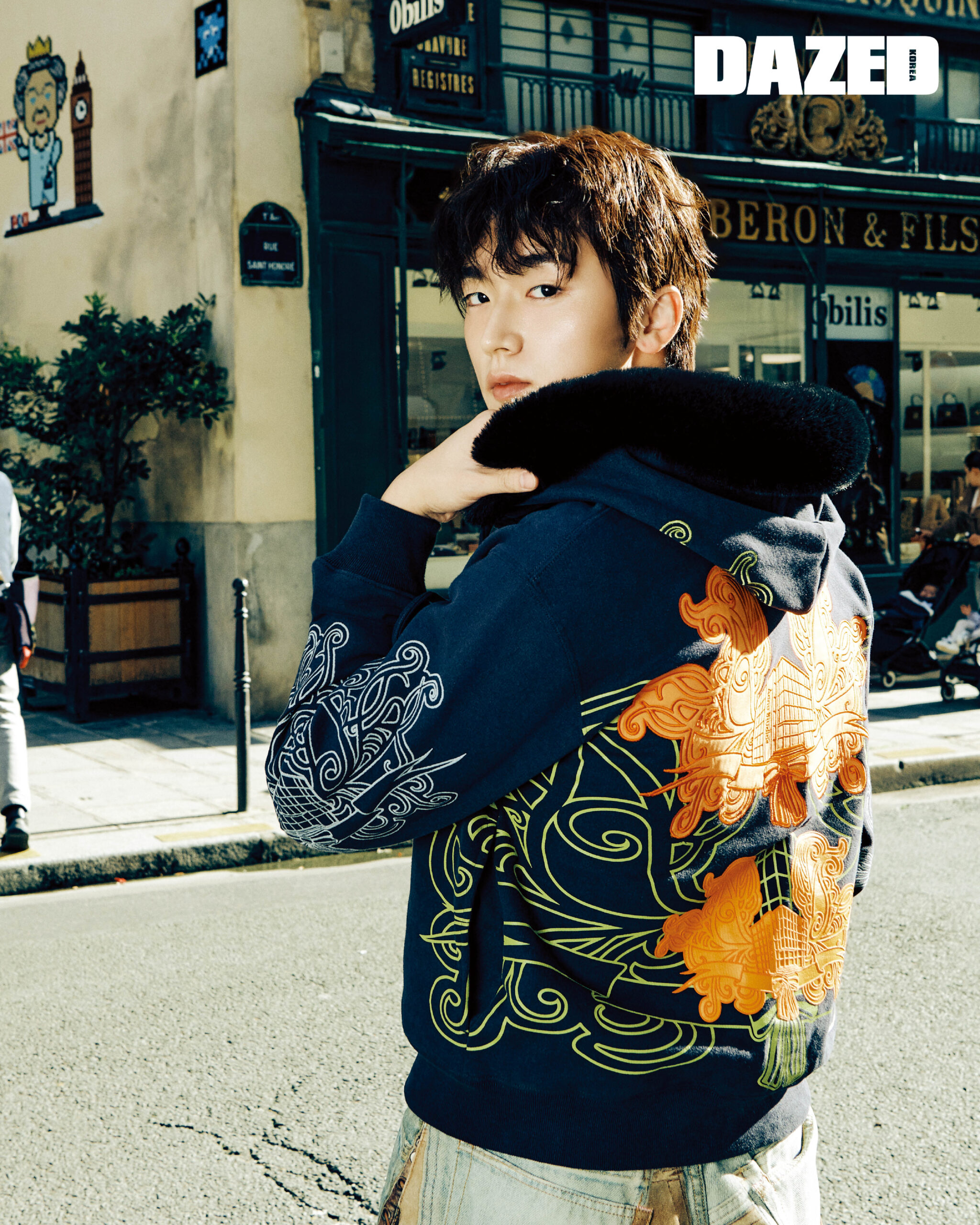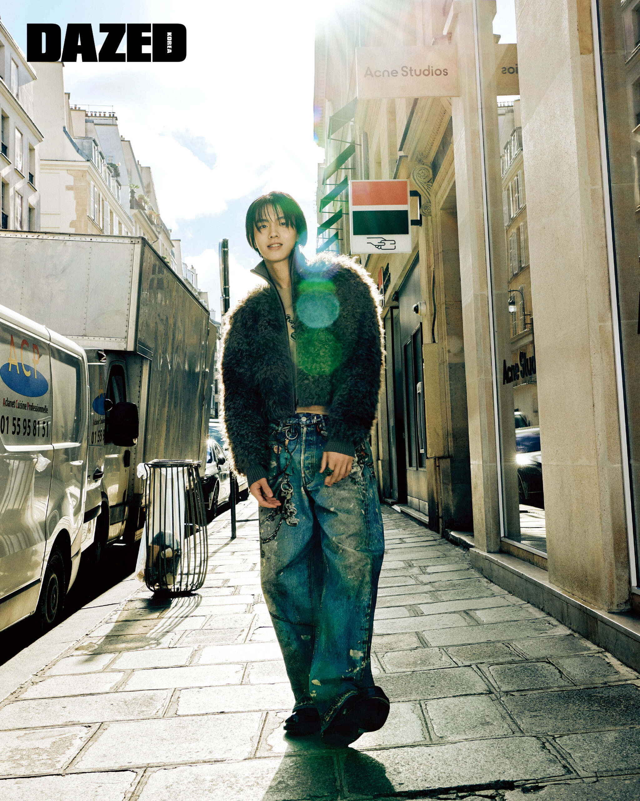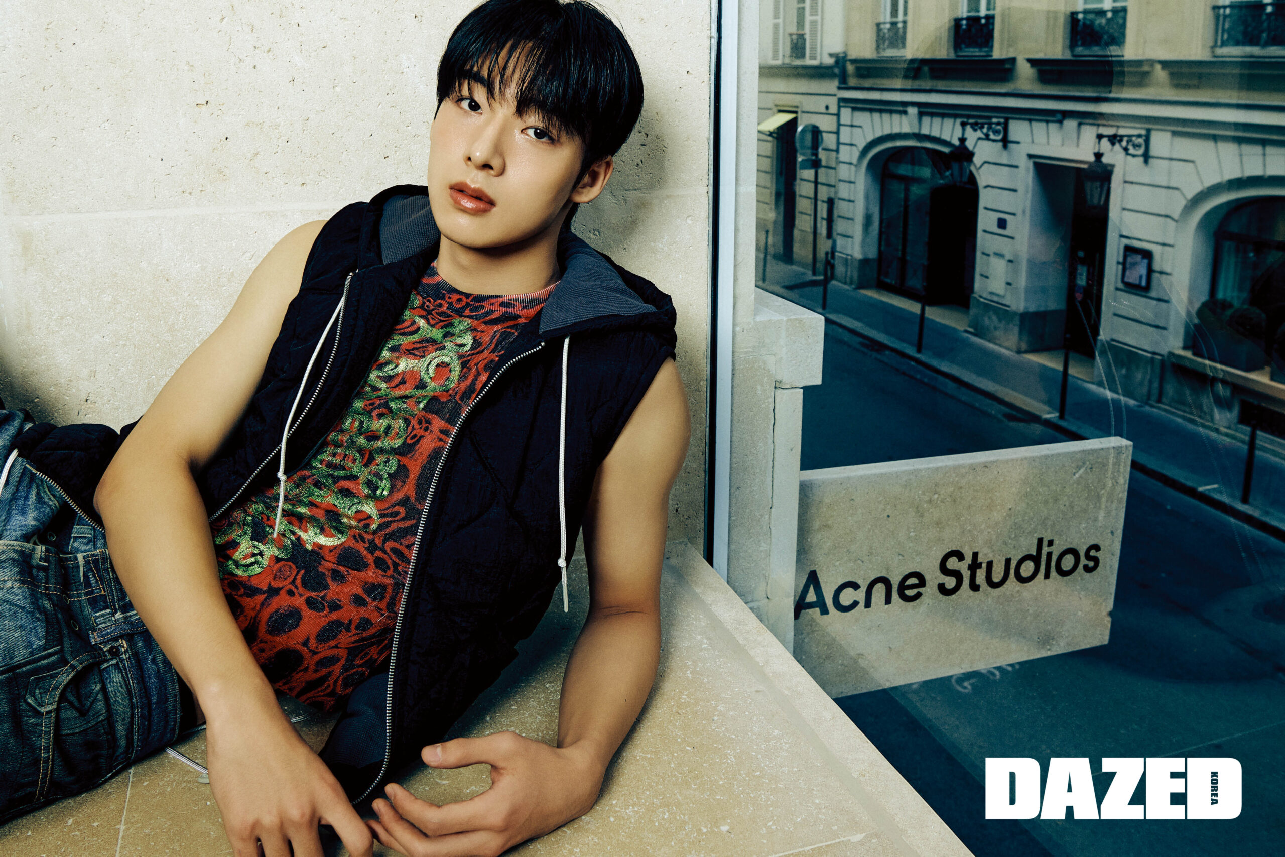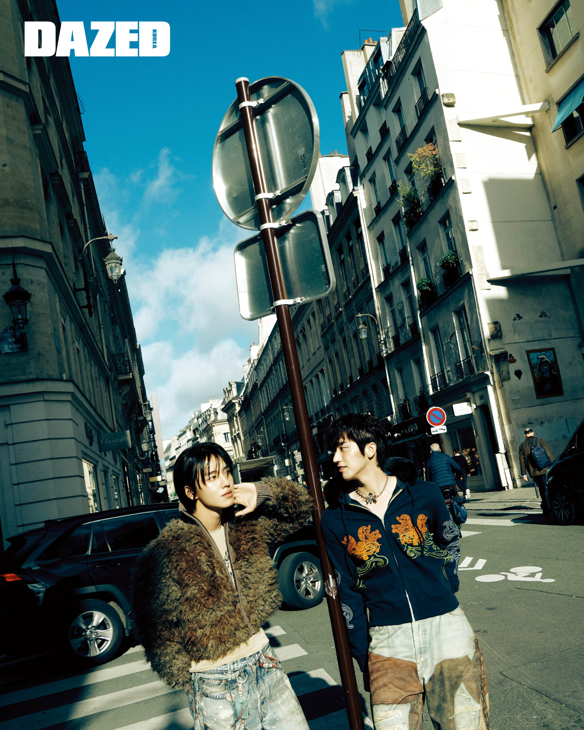 규빈이 입은 퍼 재킷과 네크리스 프린트 톱, 체인 프린트 데님 팬츠, 볼드 링은 모두 아크네 스튜디오(Acne Studios). 현준이 입은 퍼 트리밍 프린트 후드 집업과 프린트 데님 배기 팬츠, 플라워 참 포인트의 볼 체인 네크리스, 왼손에 착용한 블루 플라워 링, 오른손에 착용한 핑크 플라워 링은 모두 아크네 스튜디오(Acne Studios).