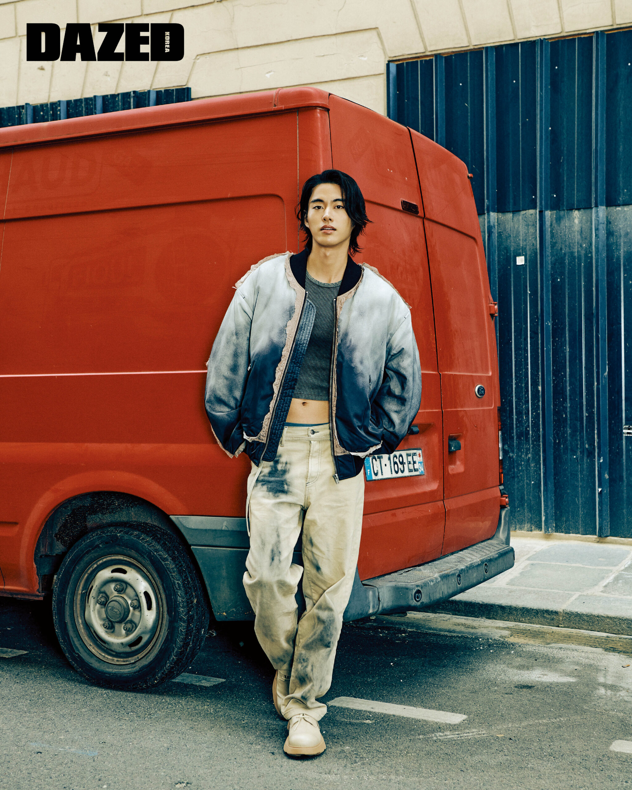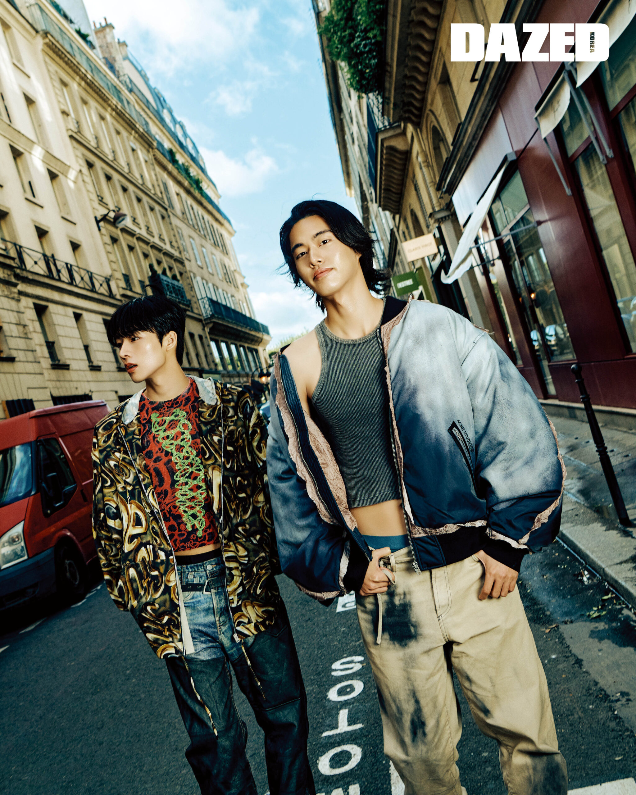 태영이 입은 프린트 후드 집업과 포일 프린트 탱크톱, 프린트 데님 팬츠, 스터드 레더 링은 모두 아크네 스튜디오(Acne Studios), 언더웨어는 태영의 것. 준이 입은 보머 재킷과 크롭트 탱크톱, 벨트 디테일의 데님 팬츠는 모두 아크네 스튜디오(Acne Studios), 언더웨어는 준의 것.