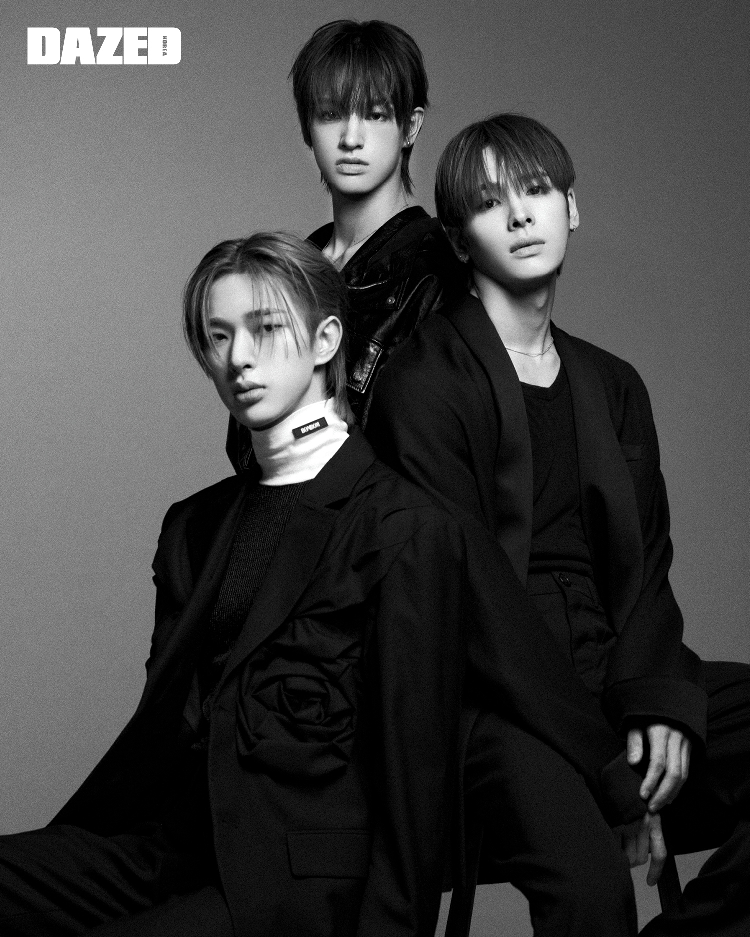 토모야가 입은 재킷은 준태킴(Juntae Kim), 터틀넥 톱은 본봄(Bonbom), 슬랙스는 스타일리스트의 것. 세이타가 입은 레더 재킷은 페라가모(Ferragamo), 이어링과 네크리스는 스타일리스트의 것. 하루가 입은 블레이저는 아미리 by 무이(Amiri by MUE), 톱과 팬츠, 이어링, 네크리스는 모두 스타일리스트의 것.