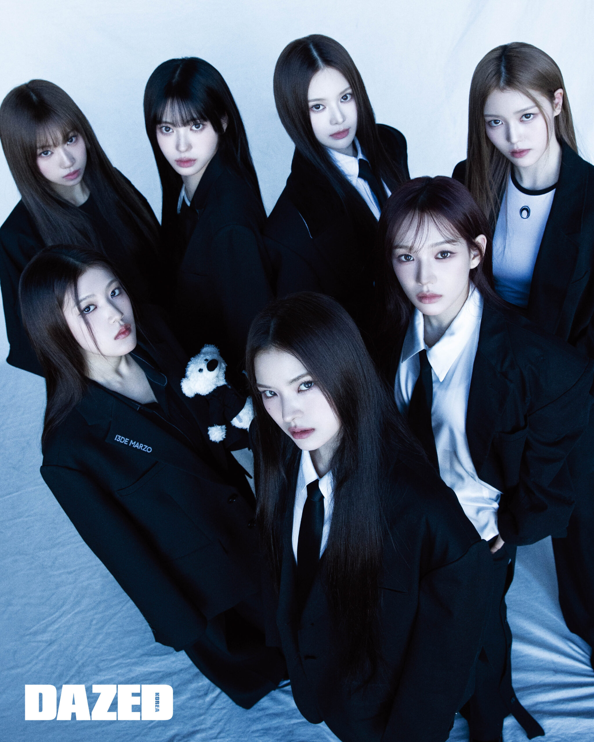 정은이 입은 소프트 울 트윌 재킷은 보테가 베네타(Bottega Veneta), 이너 톱은 스타일리스트의 것. 코코가 입은 오버핏 재킷과 이너 톱은 스타일리스트의 것. 지민이 입은 클래식 재킷과 옥스포드 셔츠, 클래식 타이는 모두 톰 브라운(Thom Browne). 세비가 입은 오버핏 재킷과 자수 이너 톱, 와이드 팬츠는 모두 스타일리스트의 것. 지윤이 입은 인형 장식 디테일 재킷은 13드 마르조(13de Marzo),베이식 셔츠와 와이드 팬츠는 스타일리스트의 것. 마이가 입은 피크트라펠 오버사이즈 재킷은 가브리엘 리(Gabriel Lee), 와이드 미디 쇼츠는 돌체앤가바나(Dolce&Gabbana), 코튼 셔츠와 타이는 스타일리스트의 것. 사랑이 입은 오버핏 싱글브레스트 재킷은 얼킨(Ul:Kin), 에나멜 펌프스 힐은 찰스앤키스(CHARLES & KEITH), 베이식 셔츠와 타이, 와이드 팬츠는 모두 스타일리스트의 것.