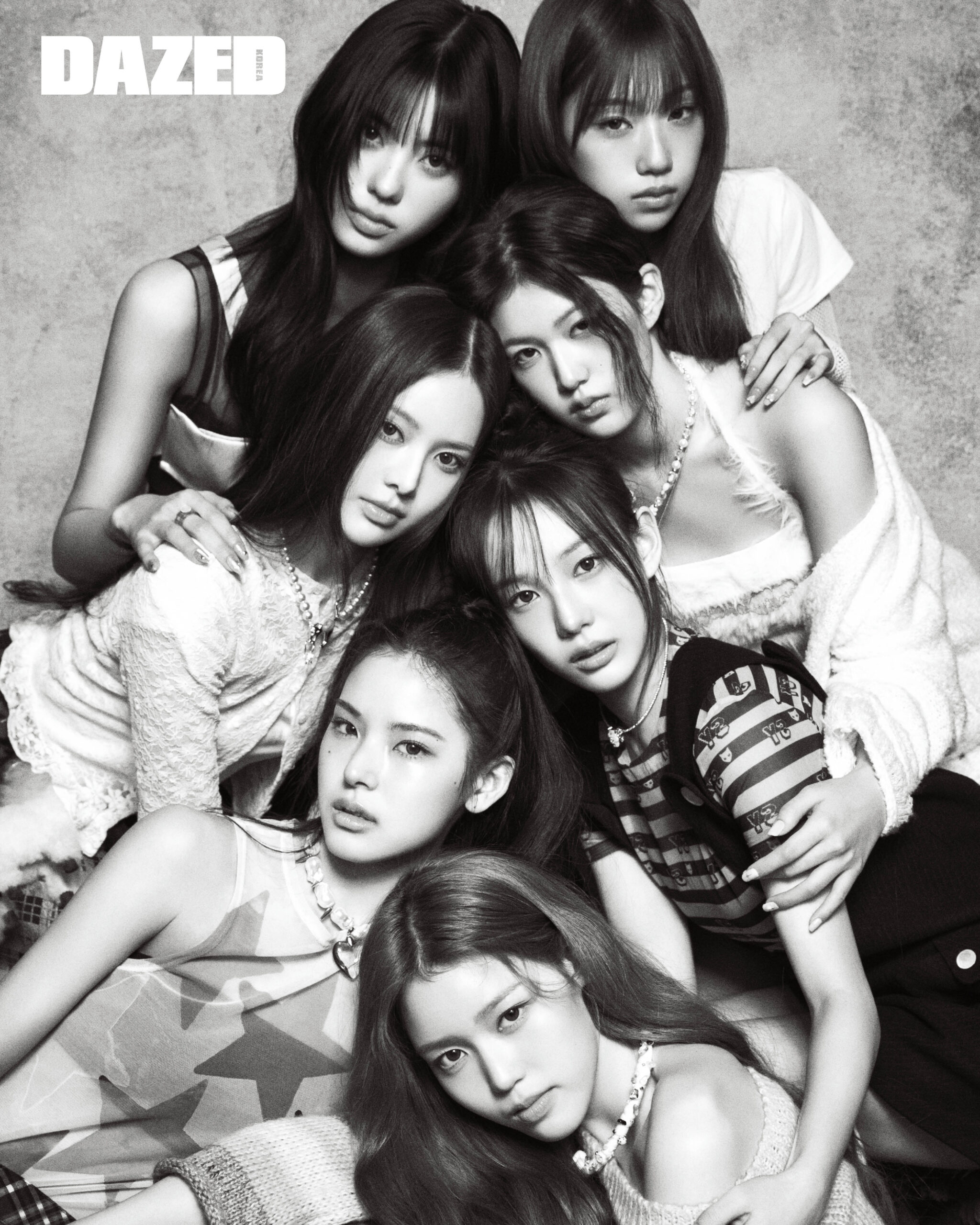코코가 입은 리본 끈 디테일의 슬리브리스 프릴 롱 드레스는 듀이듀이(Dew E Dew E), 이너로 입은 블랙 슬리브리스 드레스는 유희(Youhee), 링은 에이레브(Eireve), 위티 오벌 네일 팁은 핑거수트(Finger Suit). 정은이 입은 레터링 프린트 톱은 원더비지터(Wonder Visitor), 피치스 코핀 네일 팁은 핑거수트(Finger Suit), 이너로 입은 메시 톱은 스타일리스트의 것. 지민이 입은 플로럴 레이스 카디건은 어글리쉐도우(Ugly Shadow), 이너로 입은 톱은 페르트(Pehrt), 패턴 디테일의 스커트는 위크엔드 막스마라(Weekend Max Mara), 펜던트 펄 네크리스는 마크 제이콥스(Marc Jacobs), 스커트에 연출한 강아지 인형 키링은 에이레브(Eireve). 지윤이 입은 배색 디테일 부클 카디건은 유쓰배쓰(Youthbath), 비즈 롱 네크리스는 스윙셋(Swingset), 비즈 펄 네크리스는 트웬티원어거스(Twentyoneaugust), 실버 드로잉 네일 팁은 핑거수트(Finger Suit), 퍼 슬리브리스 크롭트 톱은 스타일리스트의 것. 마이가 입은 레이어링한 체크 패턴 포켓 벨트는 콰지퓨리티(Quasi Purity), 펄 네크리스는 허자보이에이씨씨(Hurjaboyacc), 별 프린트 메시 슬리브리스 톱과 이너로 입은 블랙 튜브톱은 스타일리스트의 것. 사랑이 입은 버튼 미니드레스는 가연 리(Gayeon Lee), 글리터 그러데이션 네일 팁은 핑거수트(Finger Suit), 스트라이프 메시 톱과 이너로 입은 블랙 튜브톱, 펜던트 펄 네크리스는 모두 스타일리스트의 것. 세비가 입은 배색 크롭트 니트 톱은 유쓰배쓰(Youthbath), 큐빅 디테일 네크리스는 이영경(Yiyounggyeoung).