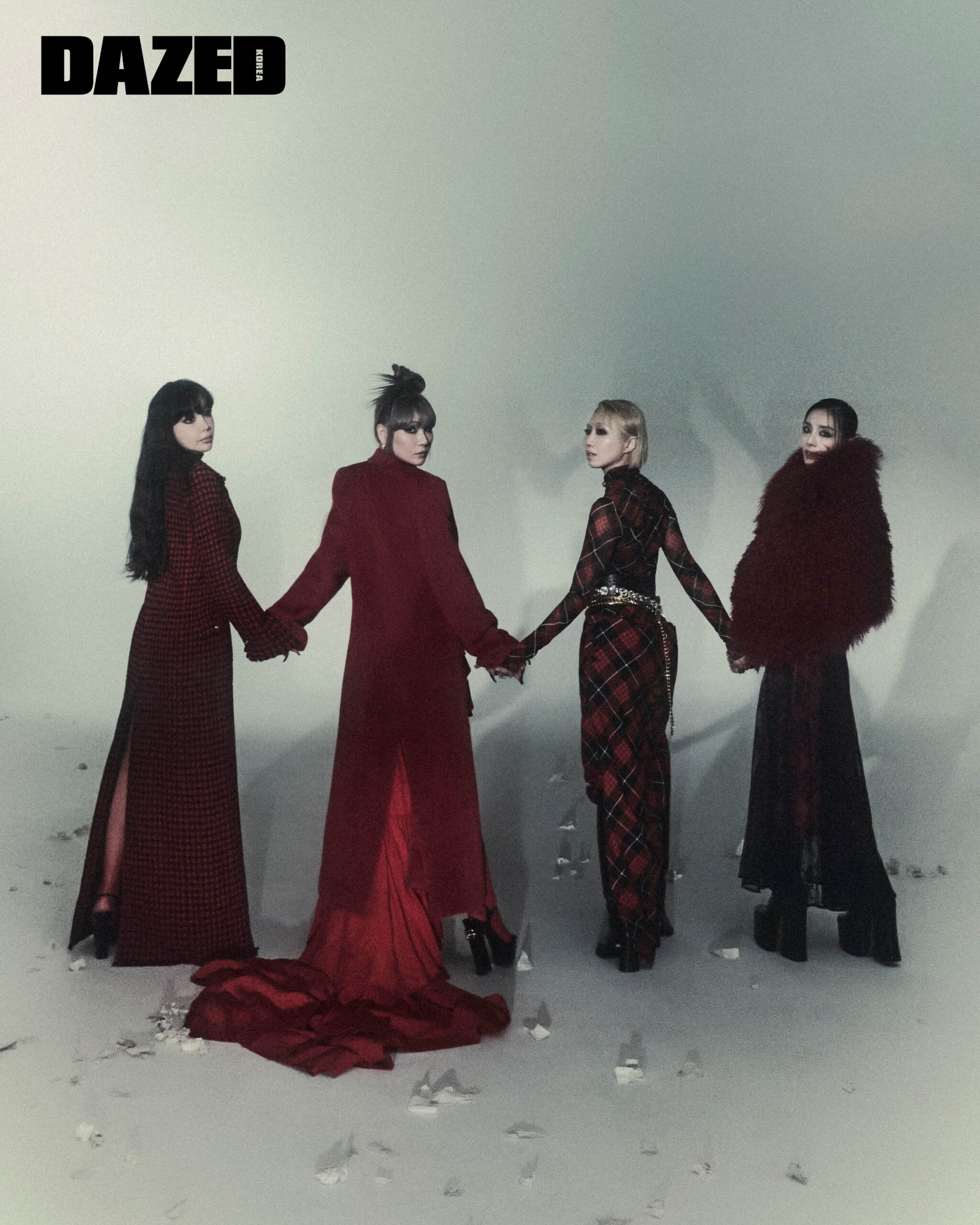 봄이 입은 체크 패턴의 레드 롱 코트와 스커트, 블랙 터틀넥 톱은 모두 베르사체(Versace), 블랙 페이던트 힐은 크리스찬 루부탱(Christian Louboutin), 십자가 펜던트 네크리스는 오리지널 크래프터(Original Crafter). 씨엘이 입은 레드 뷔스티에 톱은 규리킴(Gyouree Kim), 러플 디테일의 레드 스커트는 모스키노(Moschino), 화이트 골드 네크리스와 골드 네크리스, 이어링, 링은 모두 불가리(Bvlgari), 레드 롱 코트와 블랙 페이던트 레더 샌들은 스타일리스트의 것. 민지가 입은 레드 타탄 프린트 드레이프 메시 톱과 스커트는 장 폴 고티에 × 루이자비아로마(Jean Paul Gaultier × Luisaviaroma), 블랙 벨트는 알라이아(ALAÏA), 실버 벨트는 한나신(Hannah Shin), 골드 벨트는 베르사체(Versace), 초커와 링은 비올리나(Viollina), 블랙 롱 부츠는 스타일리스트의 것. 산다라가 입은 레드 퍼 숄은 한나신(Hannah Shin), 재킷은 준태킴(Juntae Kim), 레이스 롱 드레스와 네크리스, 벨트는 모두 돌체앤가바나(Dolce&Gabbana), 블랙 레더 부츠는 마크 제이콥스(Marc Jacobs).
