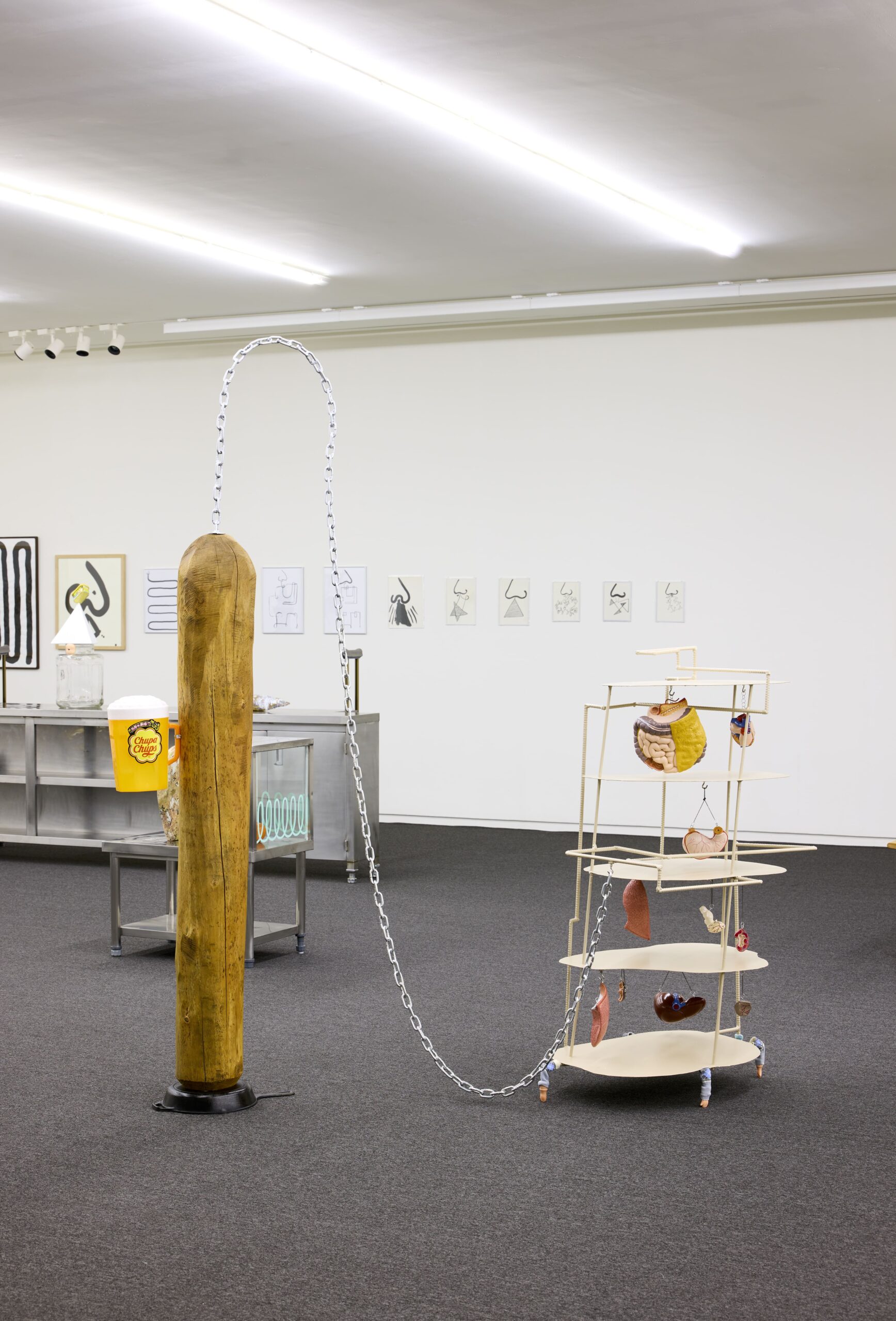 닥터 프랑켄슈타인 코스프레가 유용하게 활용되는 또 다른 이유는 인체야말로 주체의 취약함이 드러나는 장소이기 때문이다. 김 & 마스는 이번 전시에서 여러 점의 인체 해부도를 제시한다. 신체 장기로 치환된 인간은 형이하학적인 물체와 다를 바 없는 모습으로 드러난다. 작가는 섹슈얼리티와 충동, 탕진 욕구 같은 내부의 힘을 모두가 알 수 있도록 분출한다. 흡연과 알코올에 관한 모티브가 유난히 많은 것도 그런 방종과 탐닉의 문화에 깃든 개인의 자유와 열정, 어리석음을 흥미롭게 관찰하기 때문. ‘거품은 남근을 따른다(Foam Follows Phallus 2.0, 2024)’는 “형태는 기능을 따른다(Form Follows Function)”라는 모더니즘의 모토를 모방하면서 은근히 놀리는 언어유희를 즐긴다.