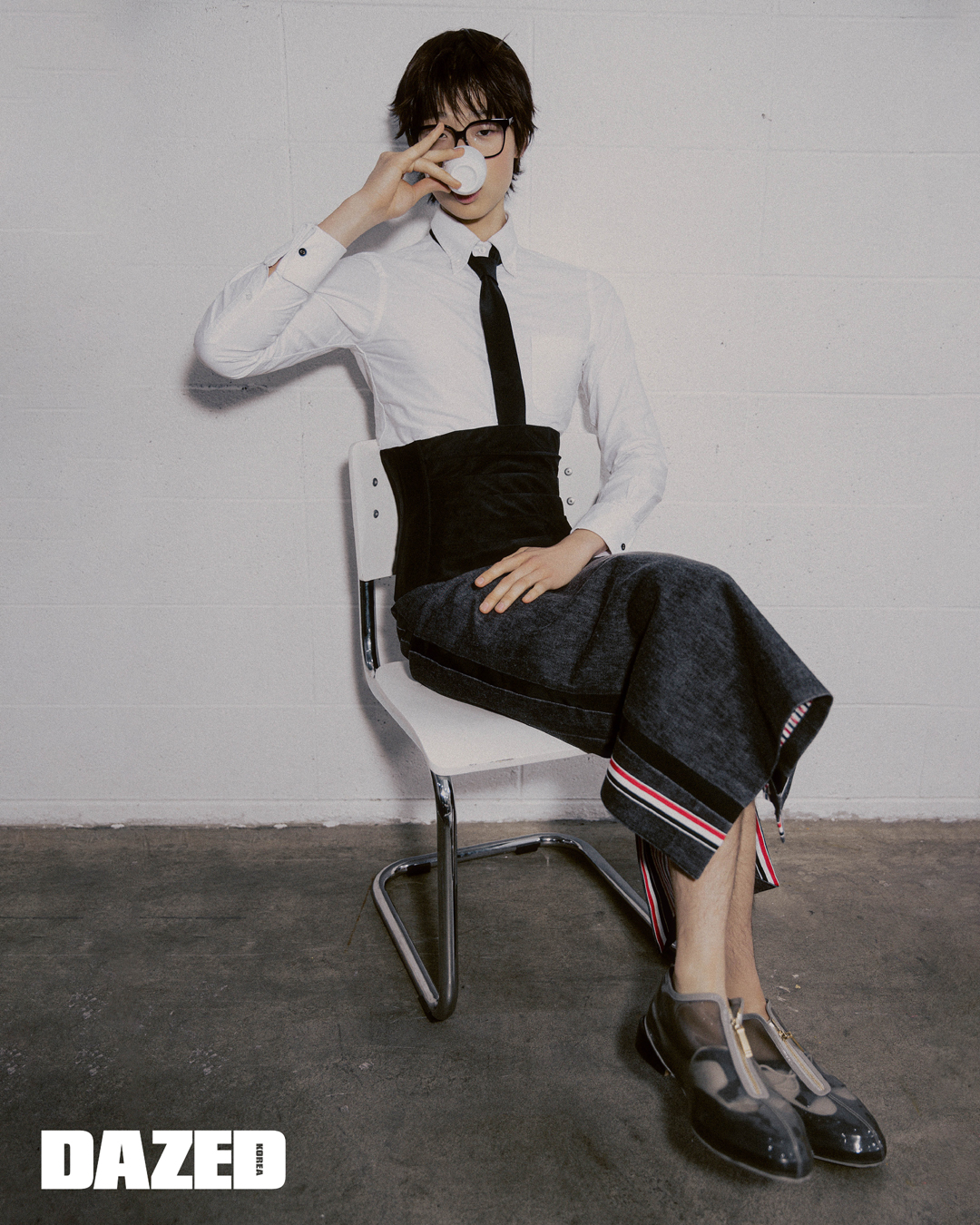 셔츠와 코르셋, 슬릿 디테일 스커트, 탈착 가능한 오버 슈즈가 레이어링된 클래식 롱윙 브로그, 타이는 모두 톰 브라운(Thom Browne), 안경은 펜디 아이웨어(Fendi Eyewear).