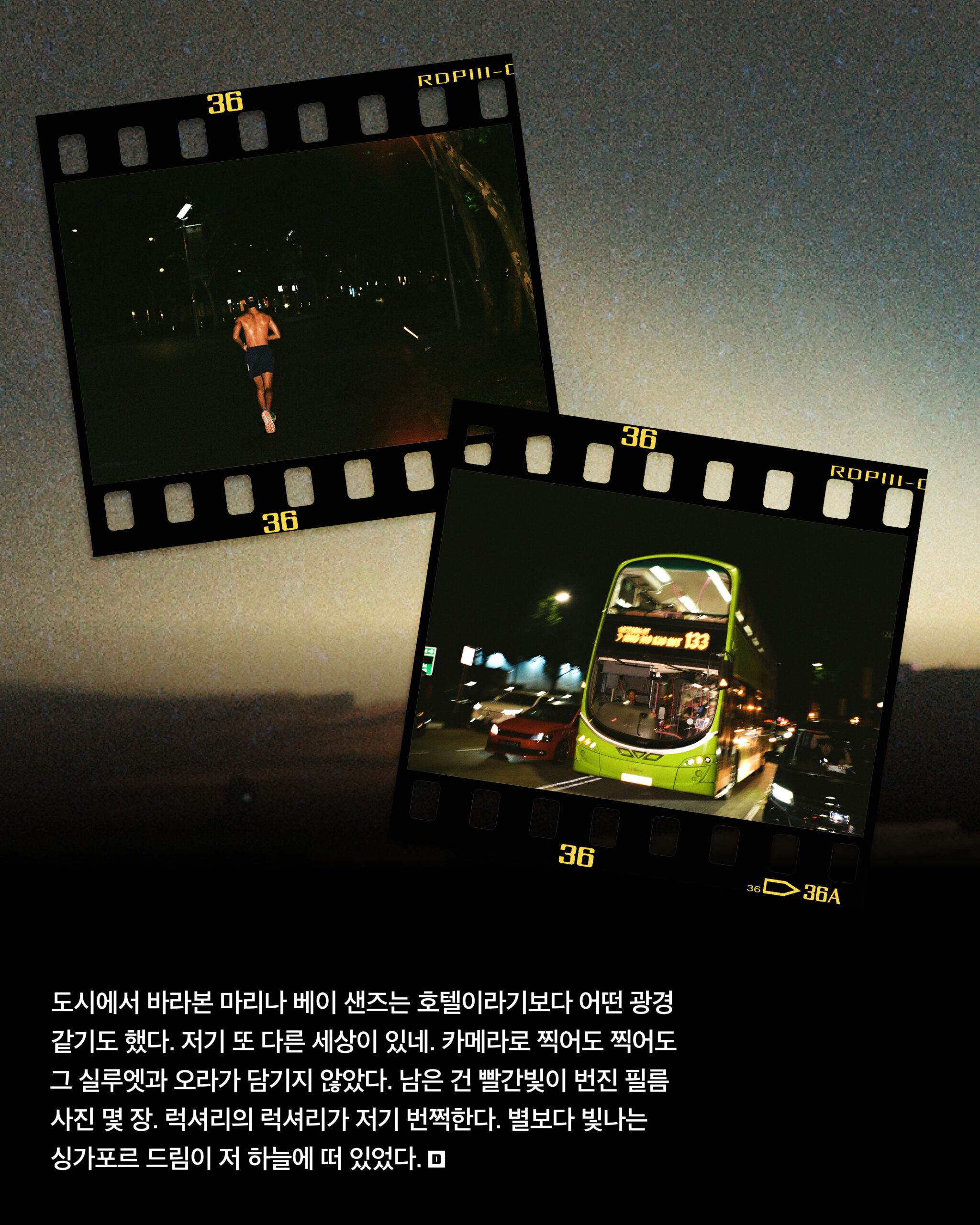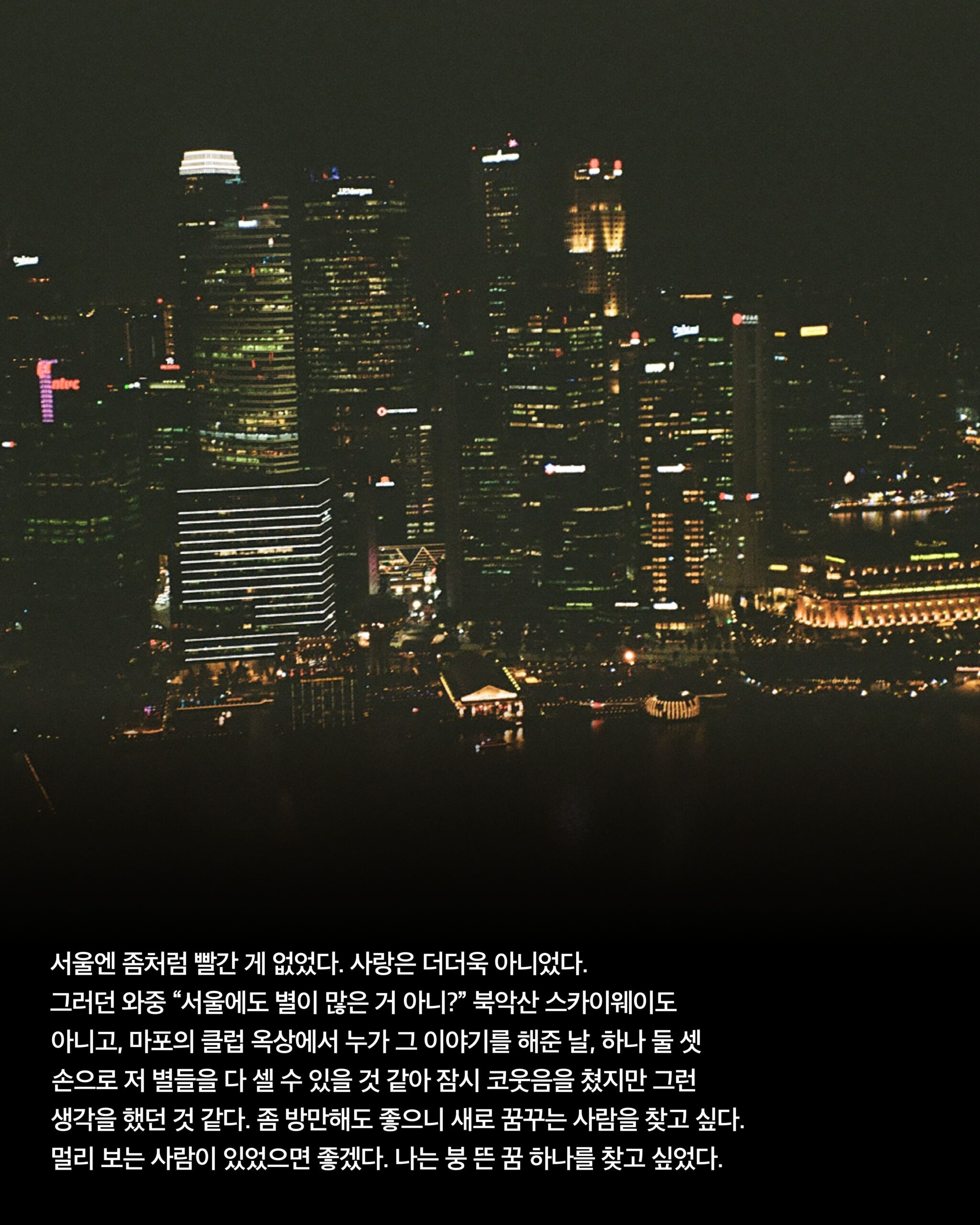 을 굴리다 끝내 춤을 막 췄다. 루서 밴드로스의 ‘Never Too Much’가 나올 때는 모두가 그랬다. 이 도시를 사랑했다. 멈추고 싶지 않았다. 발밑으로 여전히 보이는 싱가포르의 까만밤. 별이 보이든 보이지 않든 문제는 그게 아니었다. 발밑에 별 못지않은 야경들이 있었다.