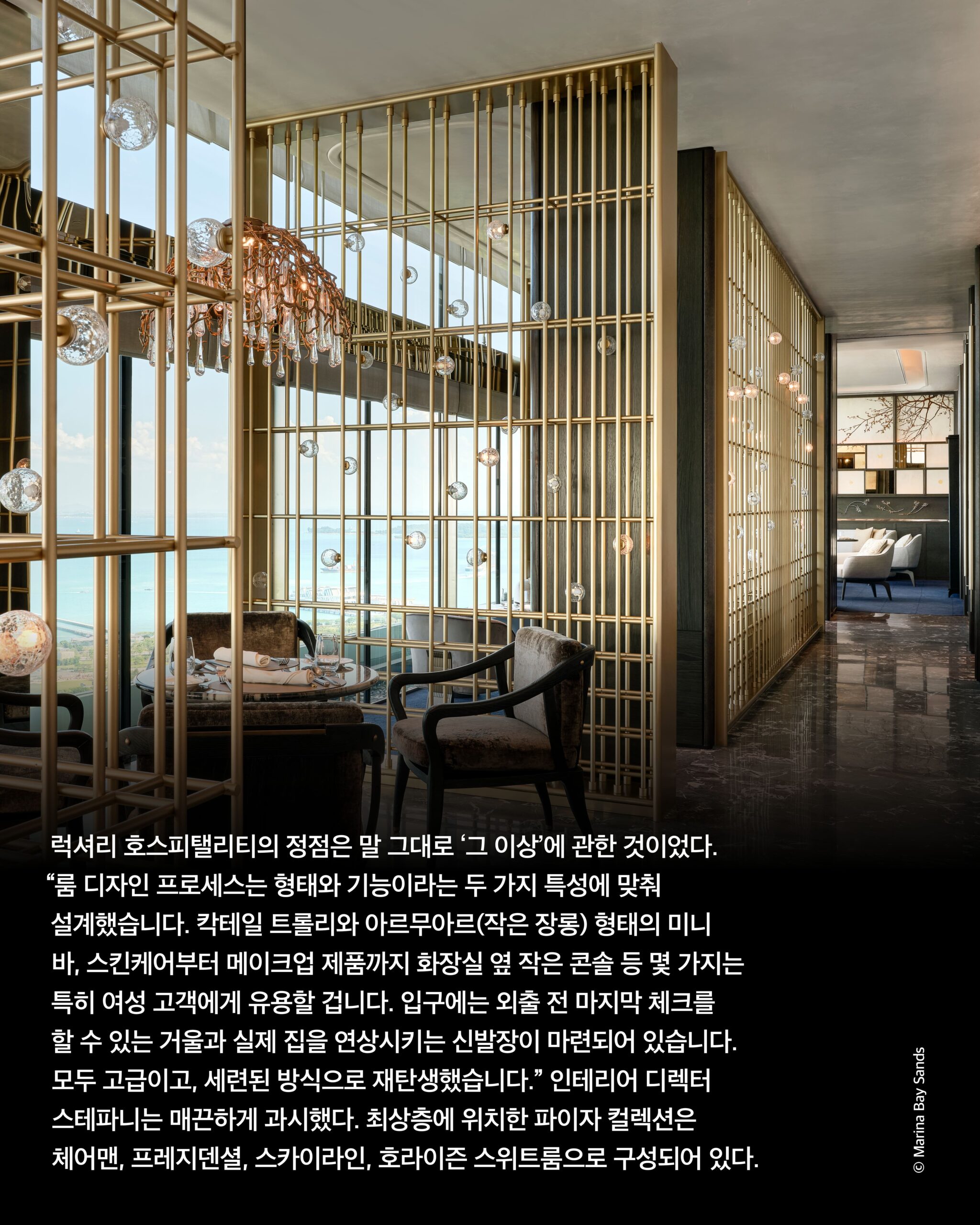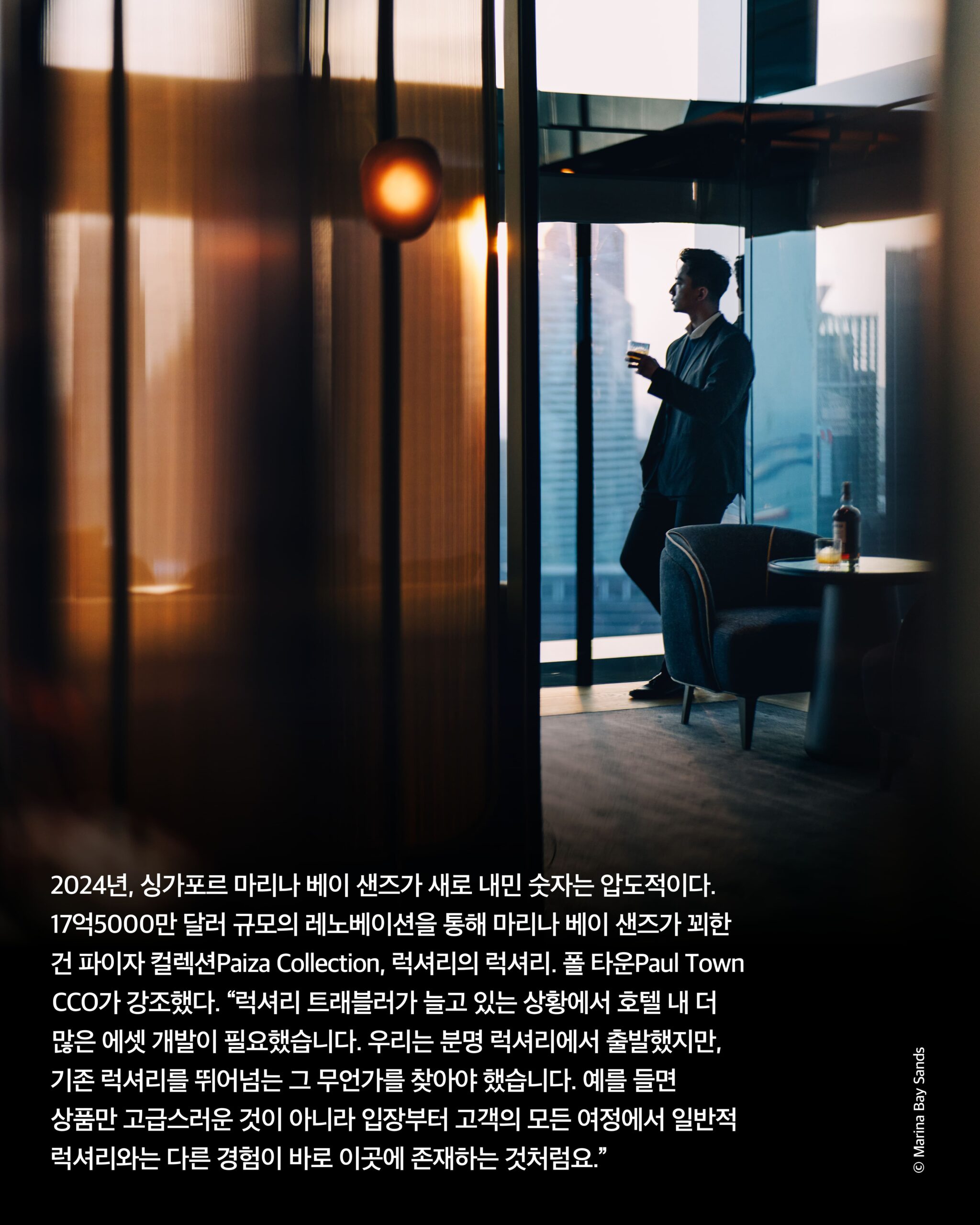 창이 국제공항에 도착해 기사의 안내를 받아 도착한 싱가포르 마리나 베이 샌즈에 들어섰다. 이들의 새로운 슬로건처럼 기사는 “모든 게 기대 이상”이라고 말했다. 전용 리프트가 있다는 파이자 컬렉션만의 로비에 가장 처음 들어선 사람처럼 입장했다. 무엇보다, 다른 호텔의 로비와 달리 조용했다. 좋지만 낯선 곳, 눈을 어디에 둘지 모를 만큼 사방으로 매끈한 대리석과 소파, 테이블을 멀뚱멀뚱 보고 있으니 누군가 나타나 잠시 앉아 있길 권한다. “차나 커피 한잔 드릴까요?” 새로운 호화 객실과 시설은 단순히 규모만으로 설명할 수 없는 그 이상일 것이다. 마케팅 총괄이사 아이린 린Irene Lin이 부드러운 미소로 설명을 이어갔다. “우리에겐 진정한 럭셔리에 대한 야망이 있었어요. 그저 제품만이 아니라 이곳을 찾은 이들이 문화적으로, 또 감성적으로도 몰입할 수 있는 럭셔리요. 아름다운 영감과 기억을 선사하고 싶습니다.”
