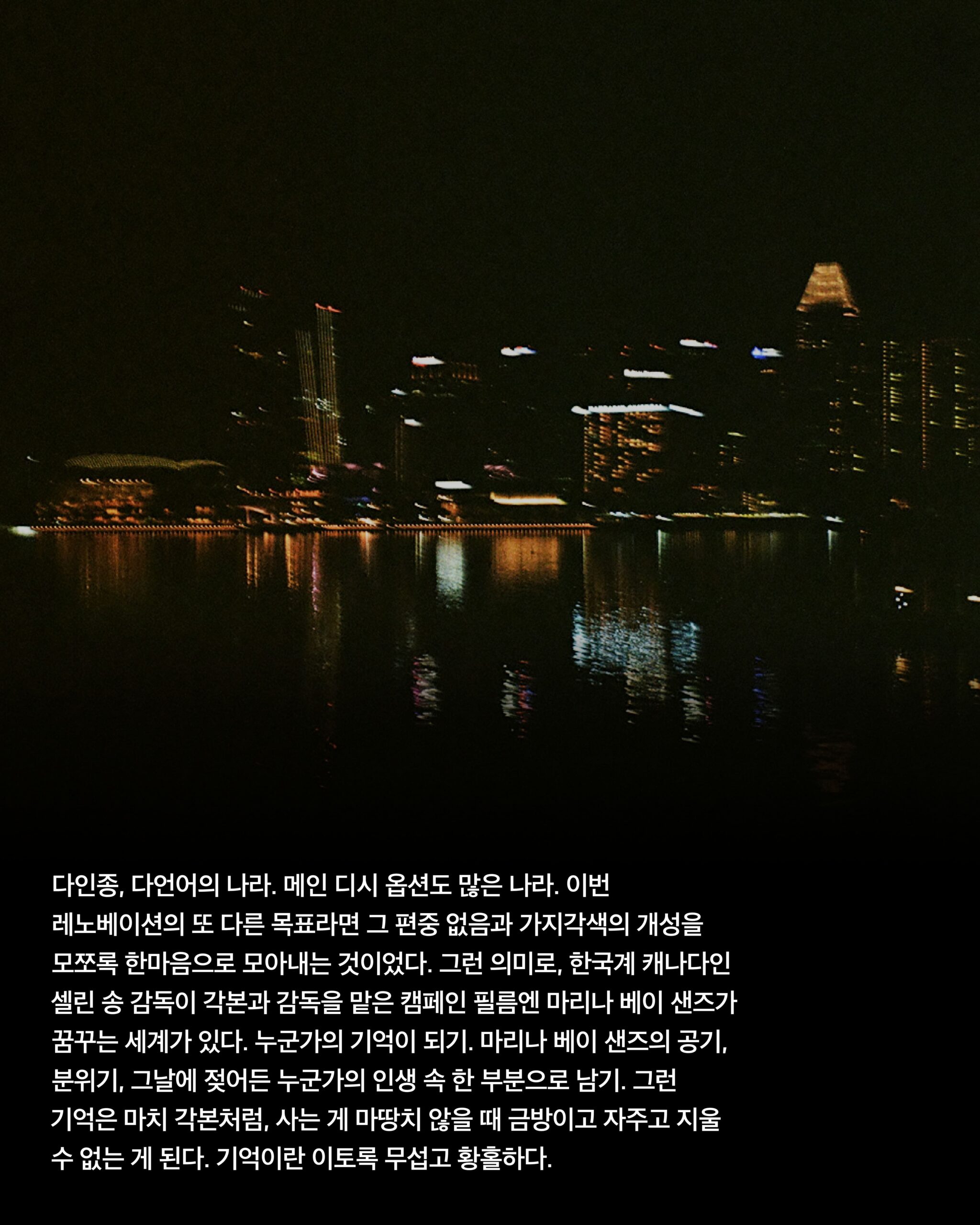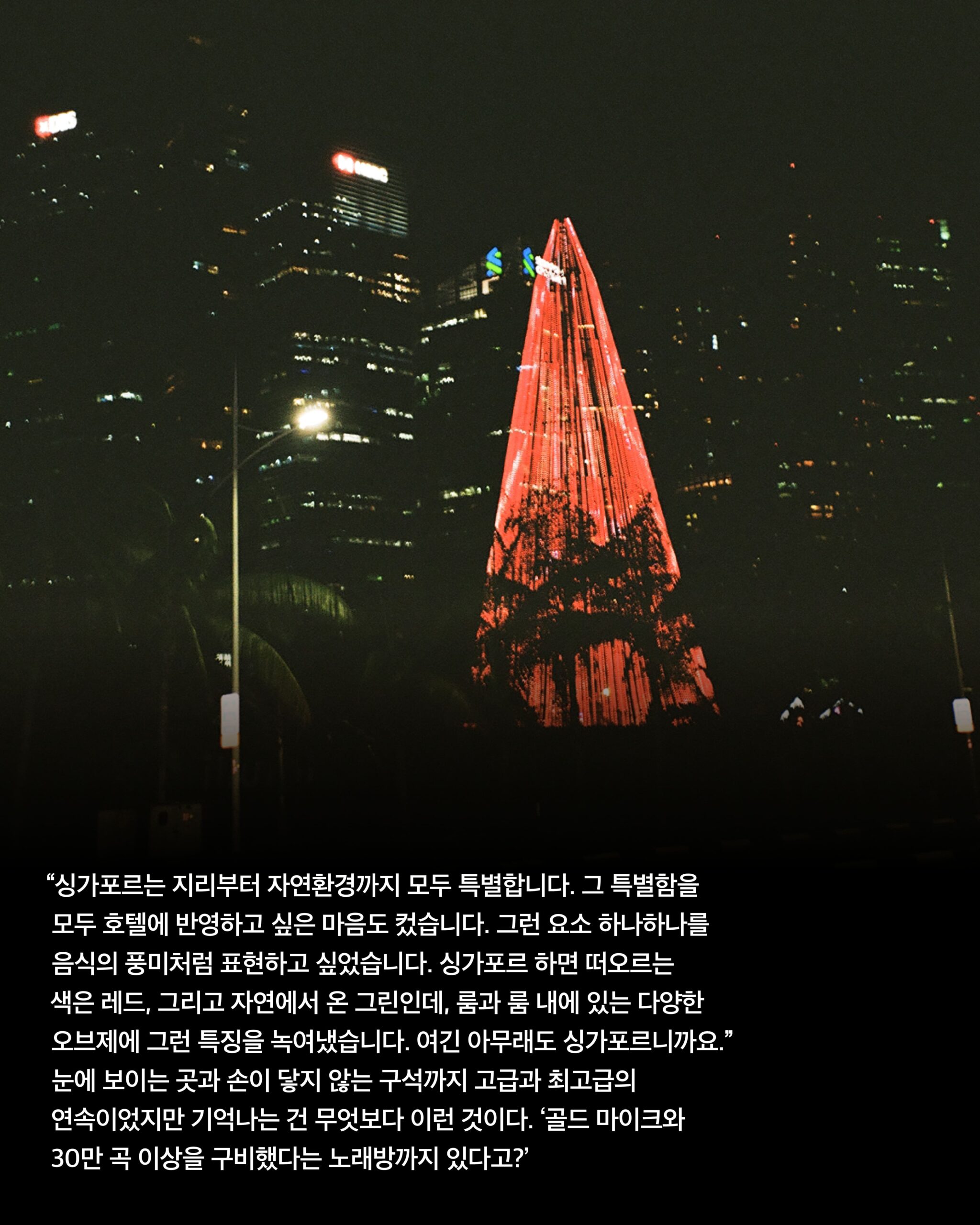 서울엔 좀처럼 빨간 게 없었다. 사랑은 더더욱 아니었다. 그러던 와중 “서울에도 별이 많은 거 아니?” 북악산 스카이웨이도 아니고, 마포의 클럽 옥상에서 누가 그 이야기를 해준 날, 하나 둘 셋 손으로 저 별들을 다 셀 수 있을 것 같아 잠시 코웃음을 쳤지만 그런 생각을 했던 것 같다. 좀 방만해도 좋으니 새로 꿈꾸는 사람을 찾고 싶다. 멀리 보는 사람이 있었으면 좋겠다. 나는 붕 뜬 꿈 하나를 찾고 싶었다. 2024년, 싱가포르 마리나 베이 샌즈가 새로 내민 숫자는 압도적이다. 17억5000만 달러 규모의 레노베이션을 통해 마리나 베이 샌즈가 꾀한 건 파이자 컬렉션Paiza Collection, 럭셔리의 럭셔리. 폴 타운Paul Town CCO가 강조했다. “럭셔리 트래블러가 더 늘고 있는 상황에서 호텔 내 더 많은 에셋 개발이 필요했습니다. 우리는 분명 럭셔리에서 출발했지만, 기존 럭셔리를 뛰어넘는 그 무언가를 찾아야 했습니다. 예를 들면 이곳의 상품만 고급스러운 것이 아니라 입장부터 고객의 모든 여정에서 일반적 럭셔리와는 다른 경험이 바로 이곳에 존재하는 것처럼요.”