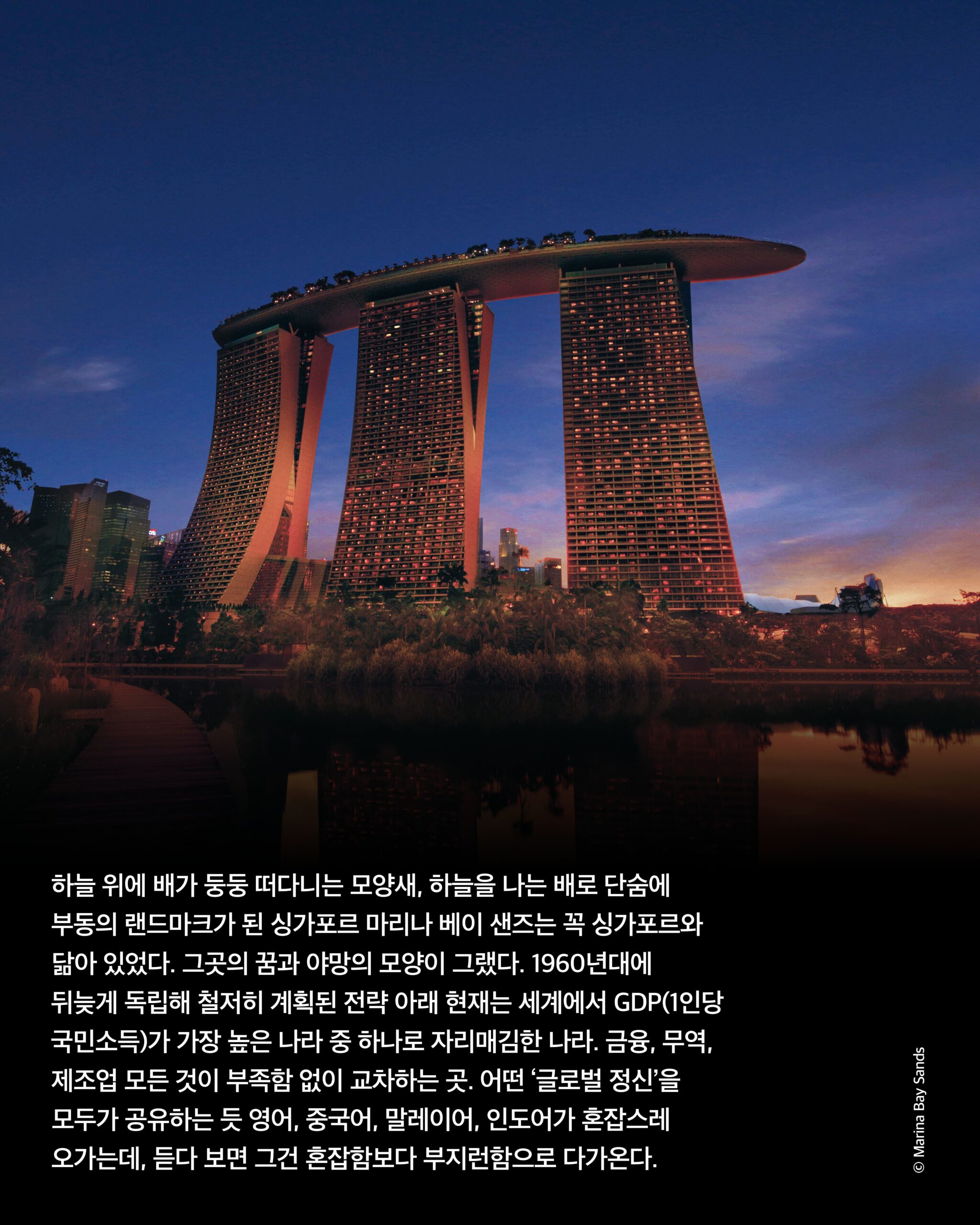 낮에도 밤에도 나는 호텔을 되도록 많이 돌아다녔다. 4일 내내 동행해 준 조우Jou는 유창한 한국어로 말했다. “일 하면서 여길 돌아다니면 하루에 1만8000보는 걷는 것 같아요.” 샤넬, 디올, 구찌, 생 로랑, 패션위크를 방불케 하는 패션 하우스 브랜드들이 쇼핑센터에 빠짐없이 모였고, 프렌치 클래식의 메종 블루드, 캘리포니아 다이닝의 스파고 다이닝룸, 그리스식 생선구이가 인상적이었던 밀로스, 한국의 밍글스를 잘 안다는 미쉐린 셰프 데쓰야 와쿠다의 일식을 다 먹고 돌아다녀도 더 갈 곳이 남아 있었다. 어딜 가도 처음 보는 길에 들어선 것 같은 기분이 좋았다. 그렇게 하루를 다 보내고 나면, 새벽엔 무작정 밖으로 나갔다. 러닝하는 사람, 맥주를 들이붓는 사람, 늦게 버스에 몸을 싣는 사람, 늦은 밤에도 오토바이를 몰던 사람, 물청소하는 몇몇 사람 사이를 걸었다. 습한 기운만 빼면 싱가포르의 새벽은 서울과 크게 다를 게 없겠지만 딱 하나 더. 서울에 없는 게 있다면 멀리서 보이는 그 호텔이 아니었을까 생각한다.