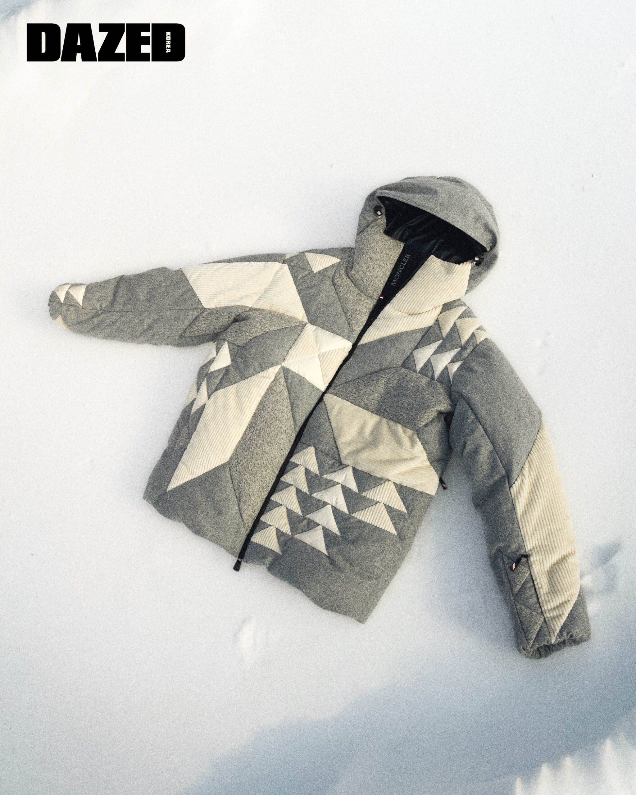 울 멜란지, 헤링본 울, 나일론, 코듀로이 등을 정교하게 재단·가공해 다운을 충전한 후 그래픽적인 패치워크로 3D 효과를 연출했다. 기술력과 장인 정신을 완벽히 구현한 이 재킷은 몽클레르 그레노블(Moncler Grenoble).