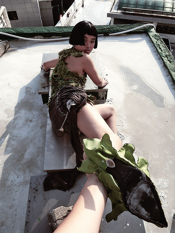 언밸런스 베스트 드레스는 사카이(Sacai), 퍼 슈러그는 스포트막스(Sportmax), 플랫폼 힐 롱부츠는 릭 오웬스(Rick Owens).