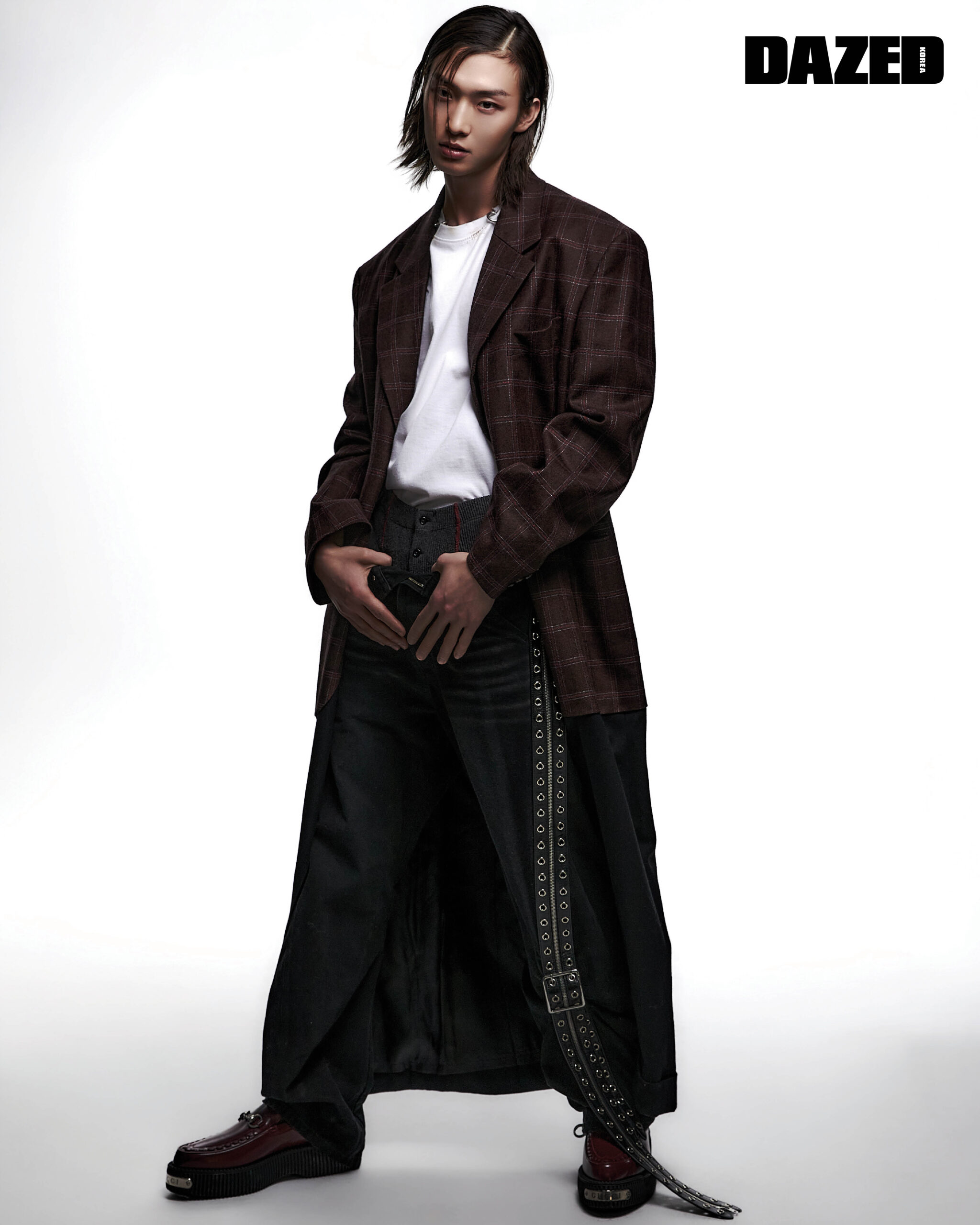 레이어링된 버건디 체크 패턴 코트는 준야 와타나베 맨(Junya Watanabe MAN), 화이트 톱과 벨트 디테일 팬츠는 웰던(We11done), 슈즈는 구찌(Gucci), 브리프는 스타일리스트의 것.