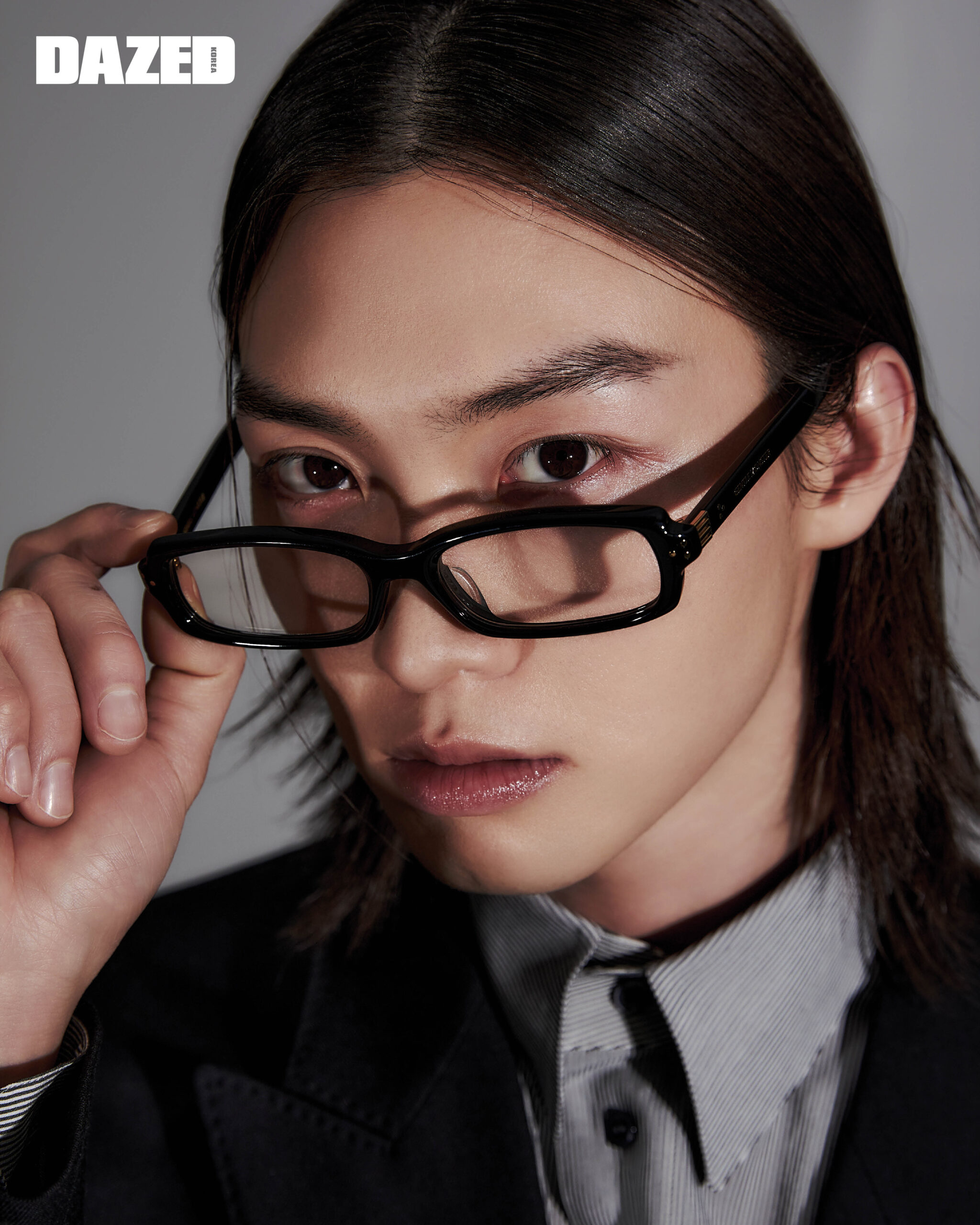 재킷과 핀스트라이프 셔츠는 생 로랑 by 안토니 바카렐로(Saint Laurent by Anthony Vaccarello), 아이웨어는 젠틀몬스터(Gentle Monster).