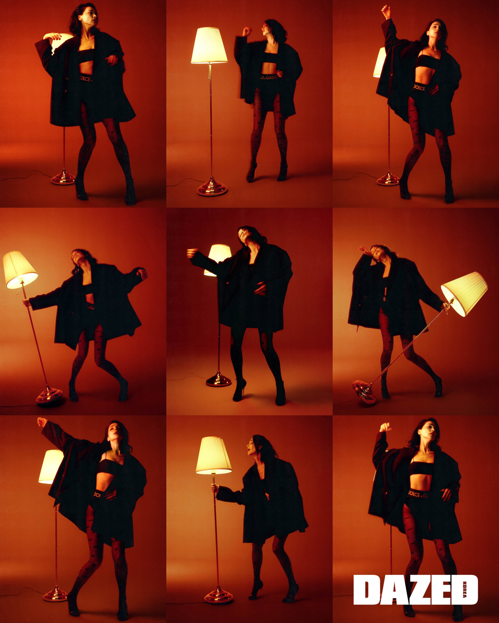 오버사이즈 재킷은 와이씨에이치(YCH), 브라톱은 토템(Toteme), 로고 웨이스트 밴드 언더웨어와 타이츠, 샌들 힐은 모두 돌체앤가바나(Dolce&Gabbana).