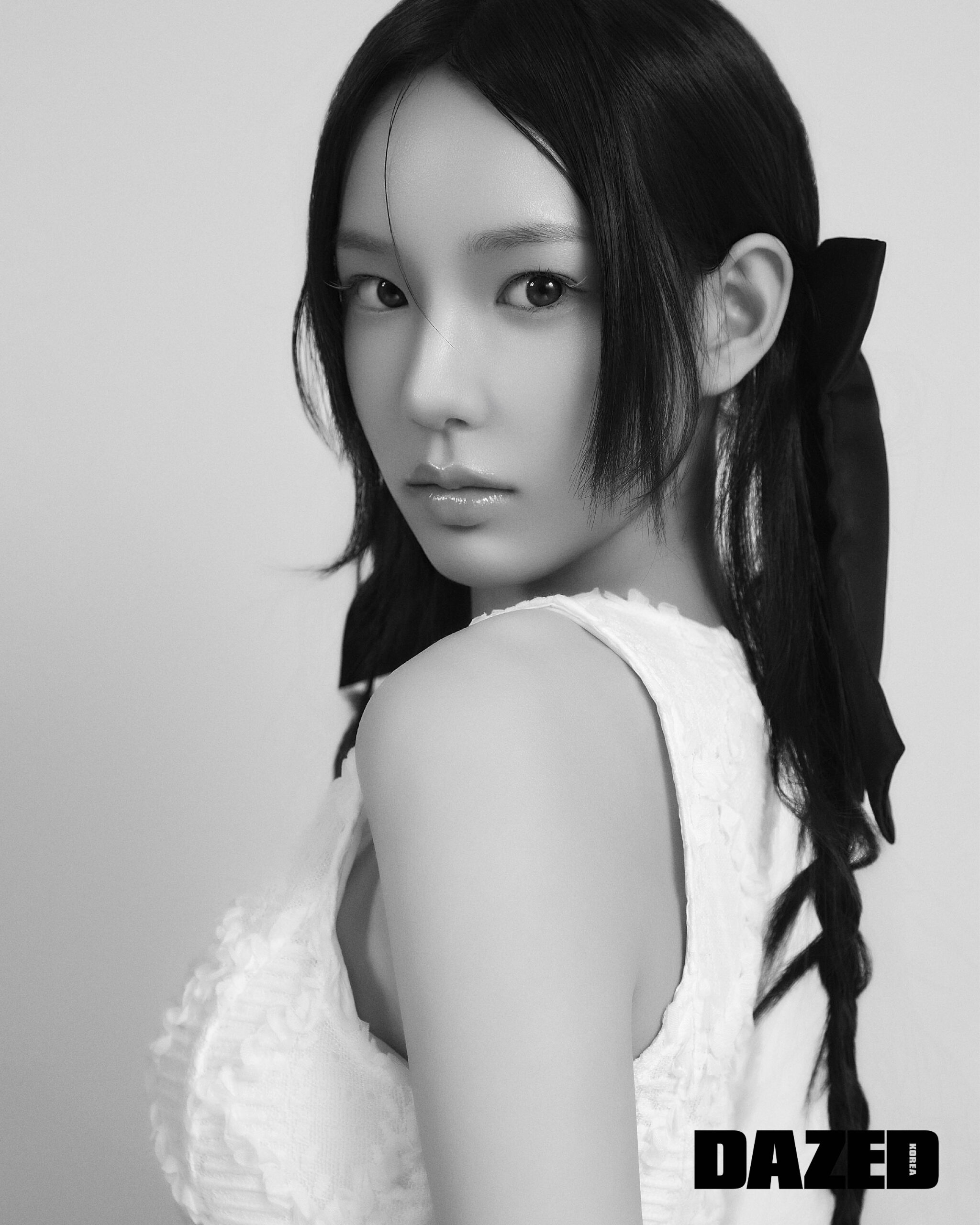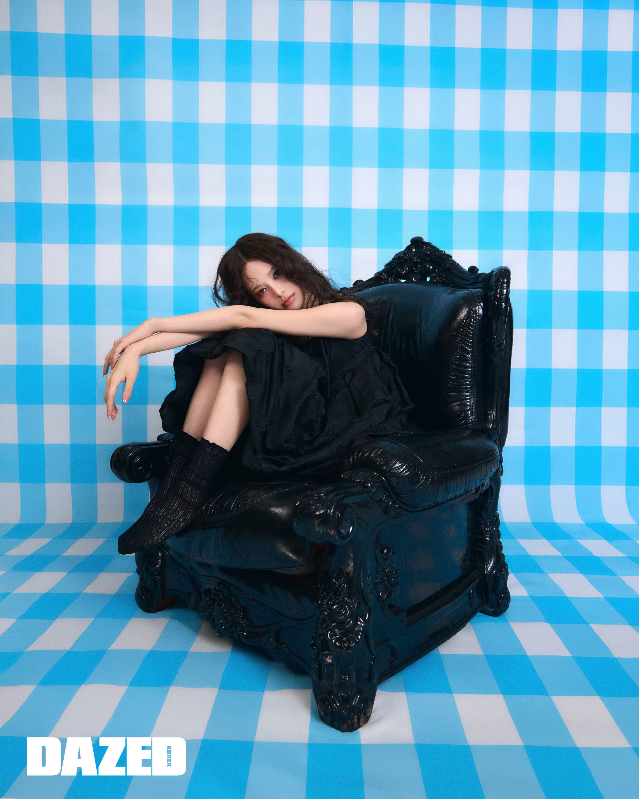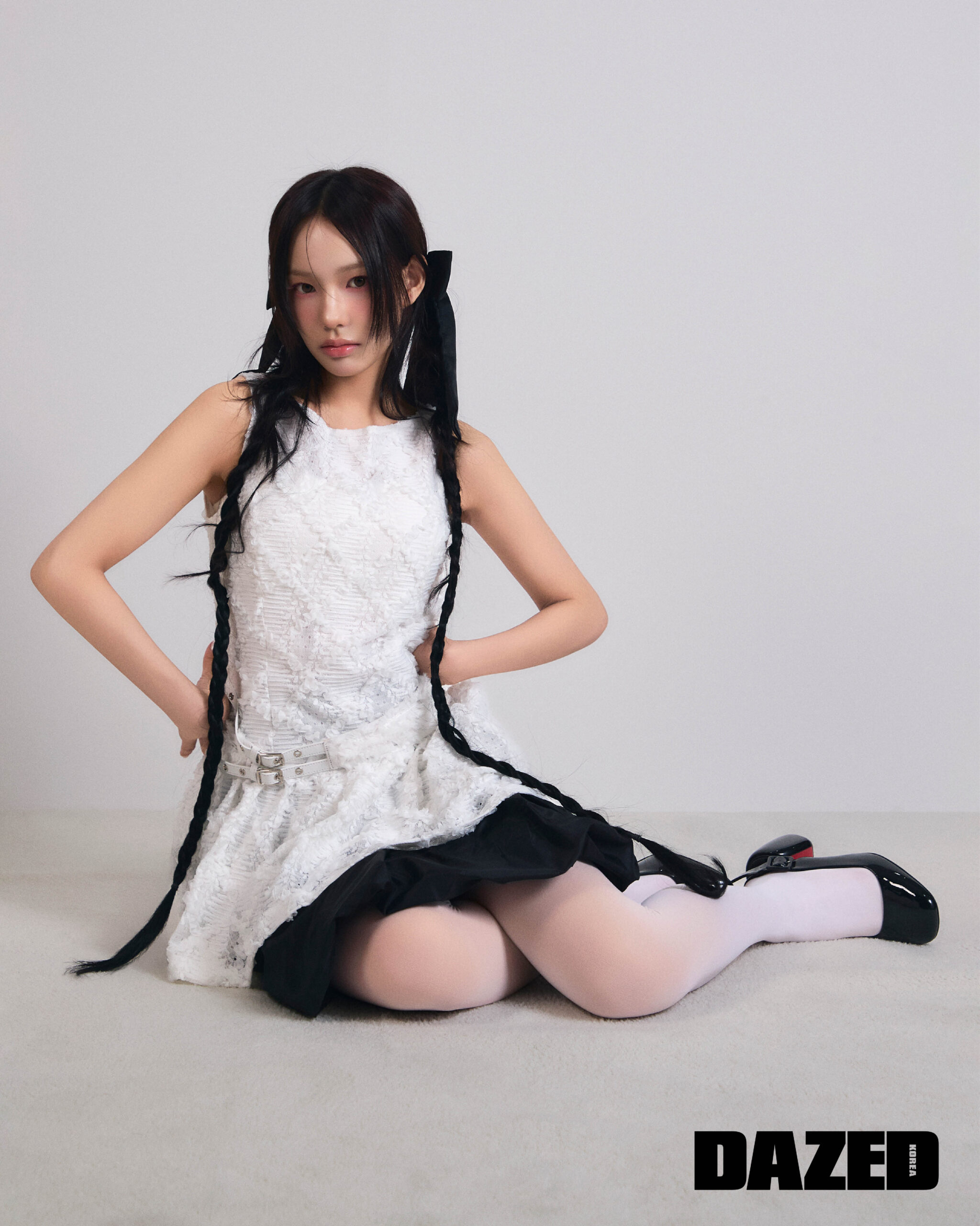 레이스 소재의 슬리브리스 드레스는 크랭크(Crank), 볼륨 스커트는 잉크(EENK), 메리제인 힐은 크리스찬 루부탱(Christian Louboutin), 프릴 디테일 벨트는 타카라바코(Takaravaco), 헤어핀과 타이츠는 스타일리스트의 것.