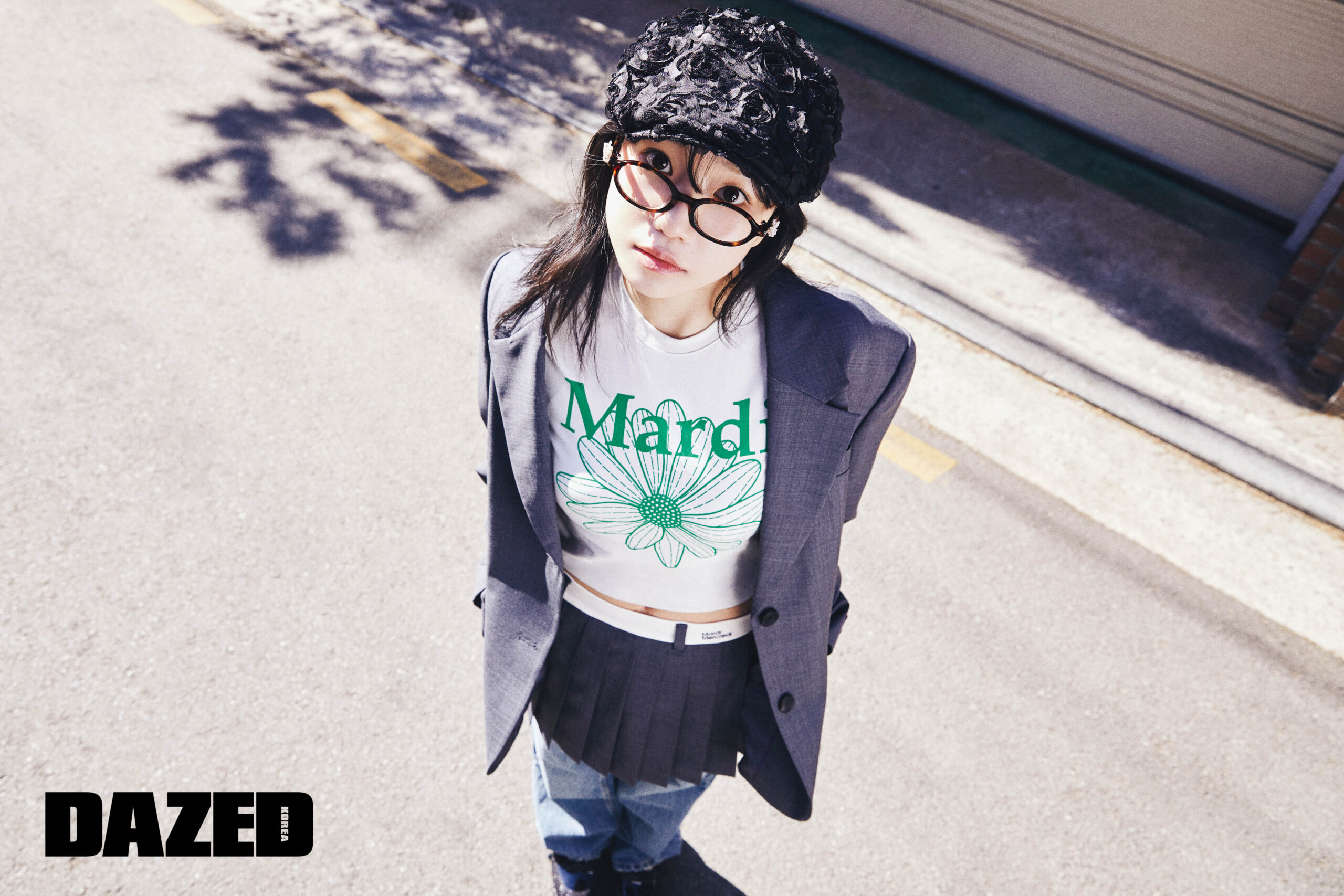 클래식 싱글 재킷과 배색 디테일의 플리츠스커트, 시그너처 플라워마르디 그래픽의 크롭트 톱, 진주 장식의 라운드 안경은 모두 마르디 메크르디(Mardi Mercredi),