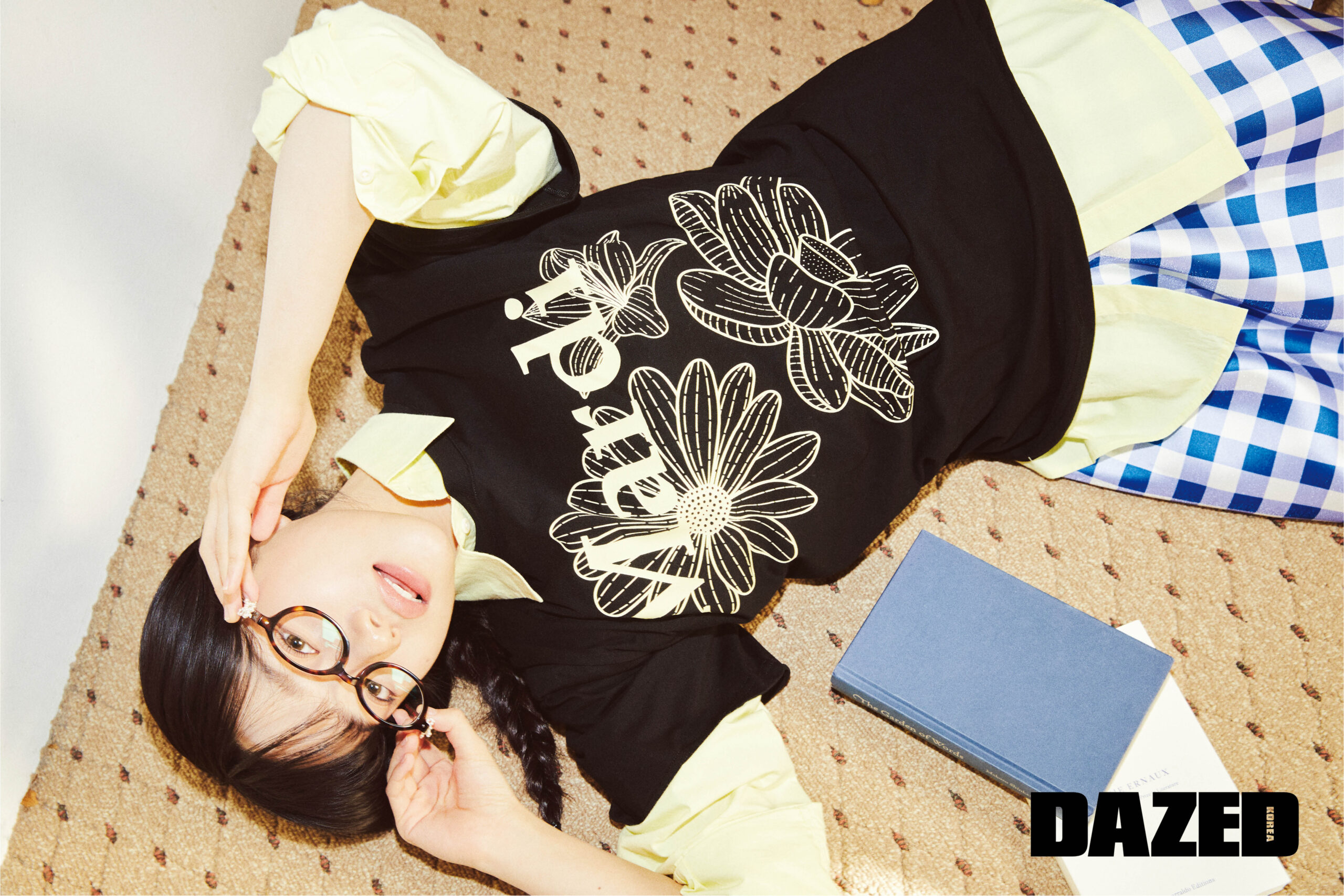 마르디 메크르디의 노란색 셔츠와 플라워 티셔츠, 그리고 파란색 깅엄 스커트 룩이 기억에 남아요. 특히 안경을 정말 좋아하는데, 촬영하면서 그 안경이 너무 예뻐 갖고 싶다고 생각했어요. 안경다리에 장식도 있어 더욱 귀엽더라고요.