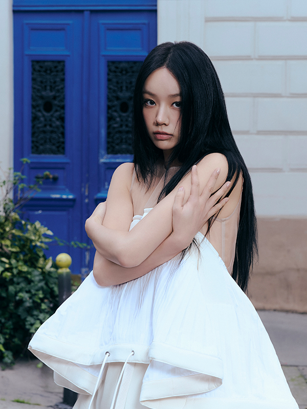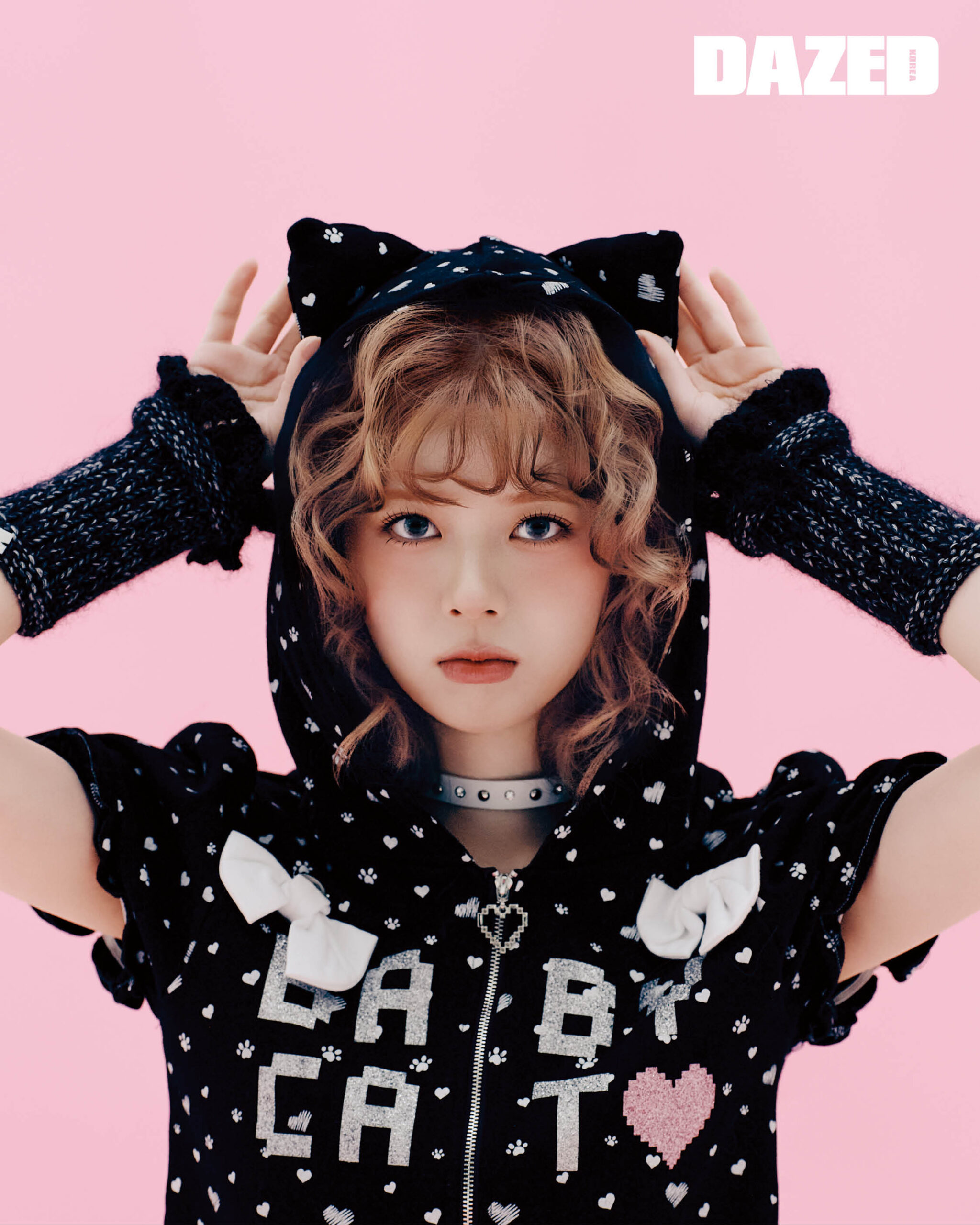 도트 패턴 재킷과 쇼츠 셋업은 에이치브레이커(HBreaker), 글리터 소재의 메리제인 슈즈는 레페토(Repetto), 초커는 에브리벌스데이(Everybirthday), 핸드 워머는 나비버스(Naviverse), 리본 디테일 타이츠는 샵사이다(Shop Cider), 레그 워머는 로맨틱타이거(Romantic Tiger).