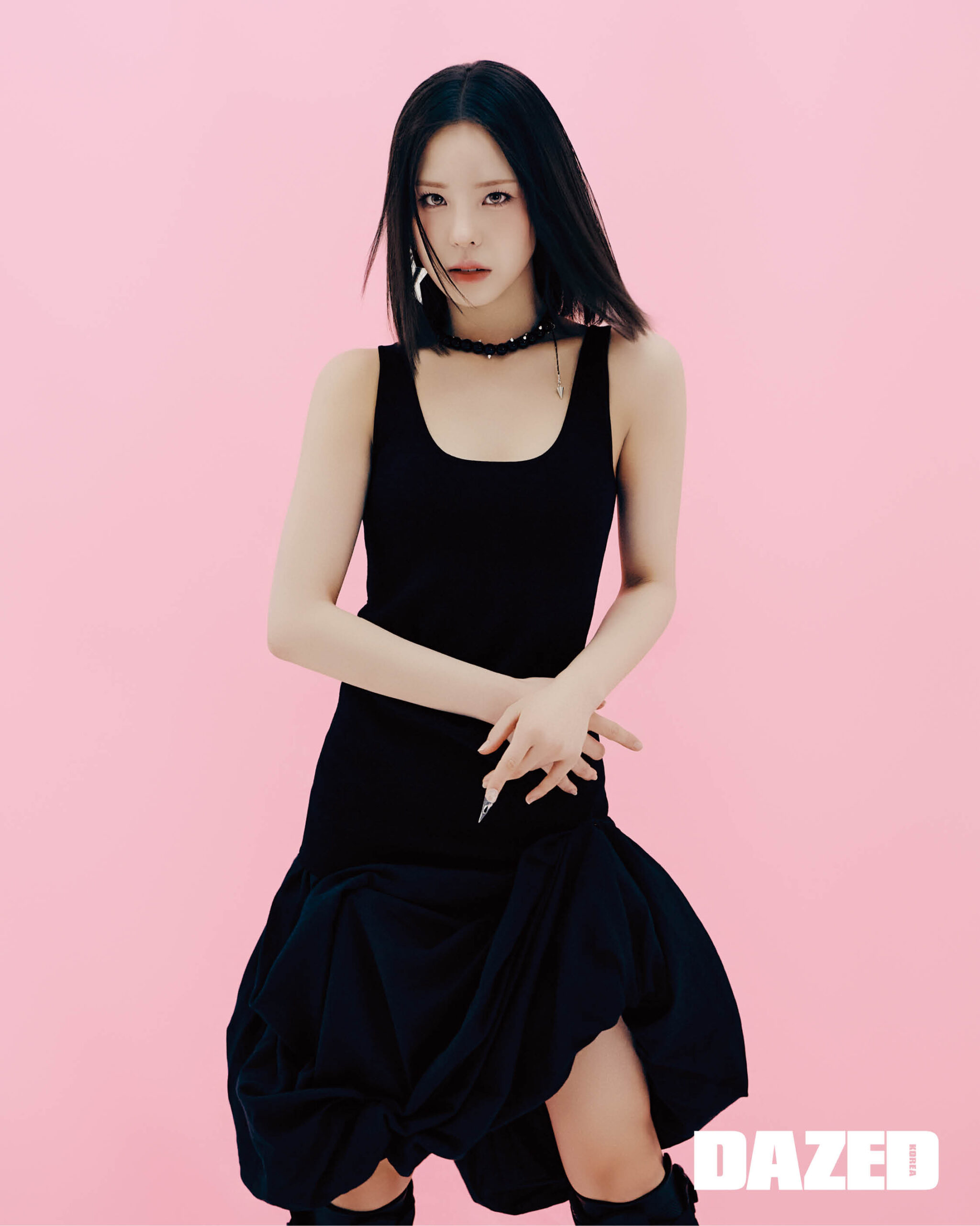 드레이핑 디테일 슬리브리스 드레스는 토템(Toteme), 모스트로 레더 부츠는 리복(Reebok), 별 펜던트 이어링은 프루타(Fruta), 뿔 디테일 진주 네크리스는 페그렉(Peg Leg).