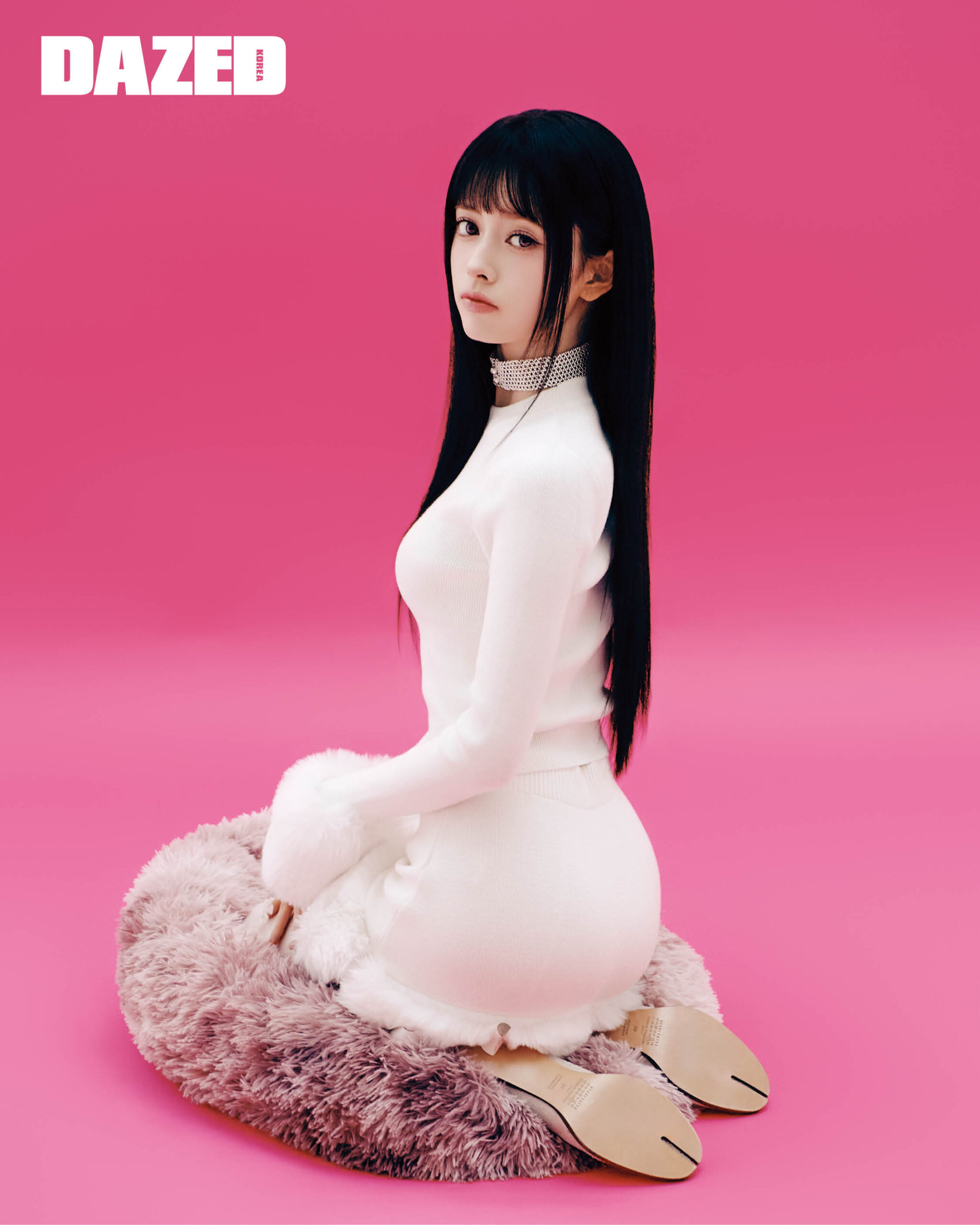 퍼 디테일 톱과 스커트는 샵사이다(Shop Cider), 타비 디자인 펌프스는 메종 마르지엘라(Maison Margiela), 진주 초커는 에이레브(Eireve).