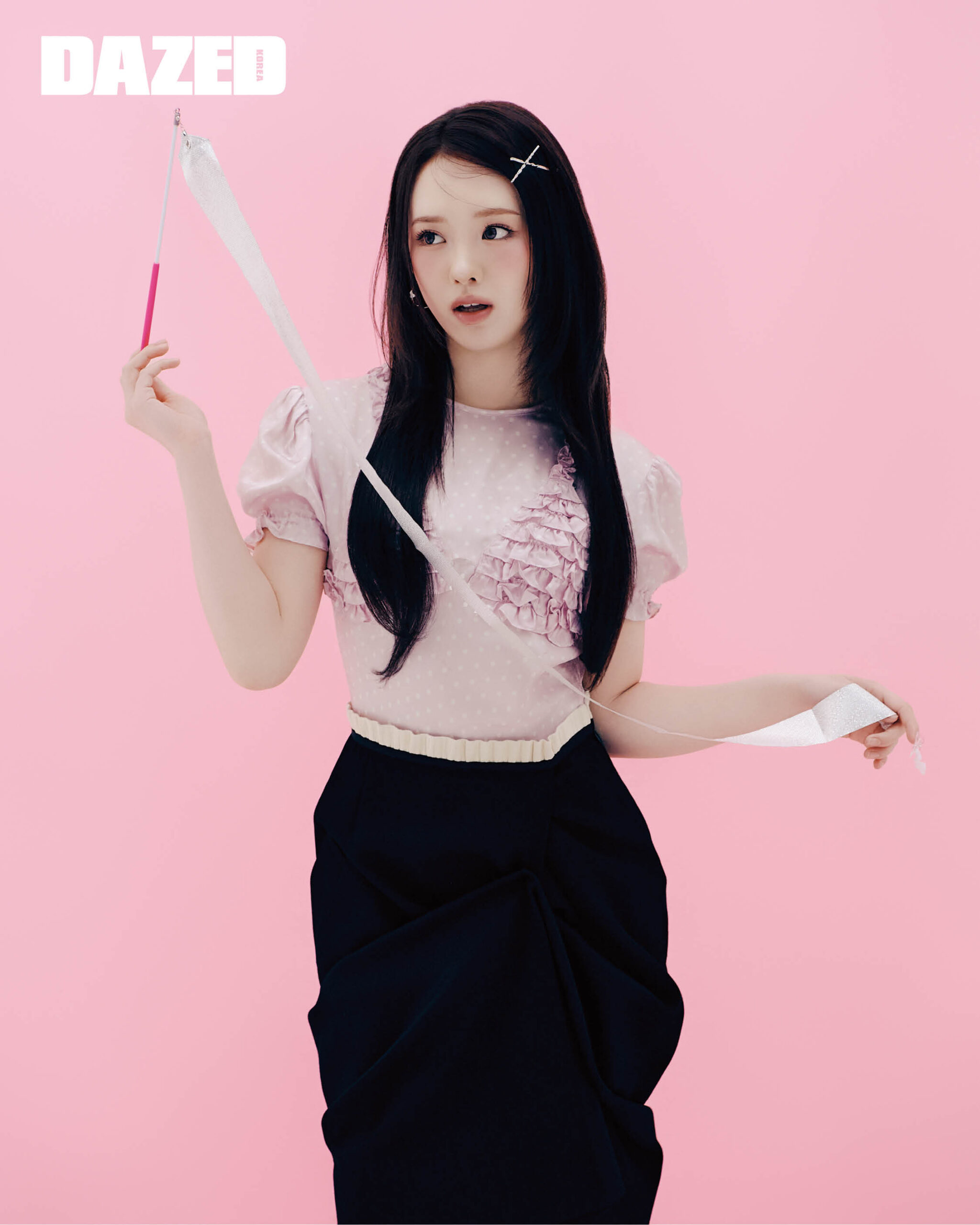 도트 패턴 프릴 드레스는 푸시버튼(PushBUTTON), 스커트는 메종 마르지엘라(Maison Margiela), 헤어핀은 에디터의 것.