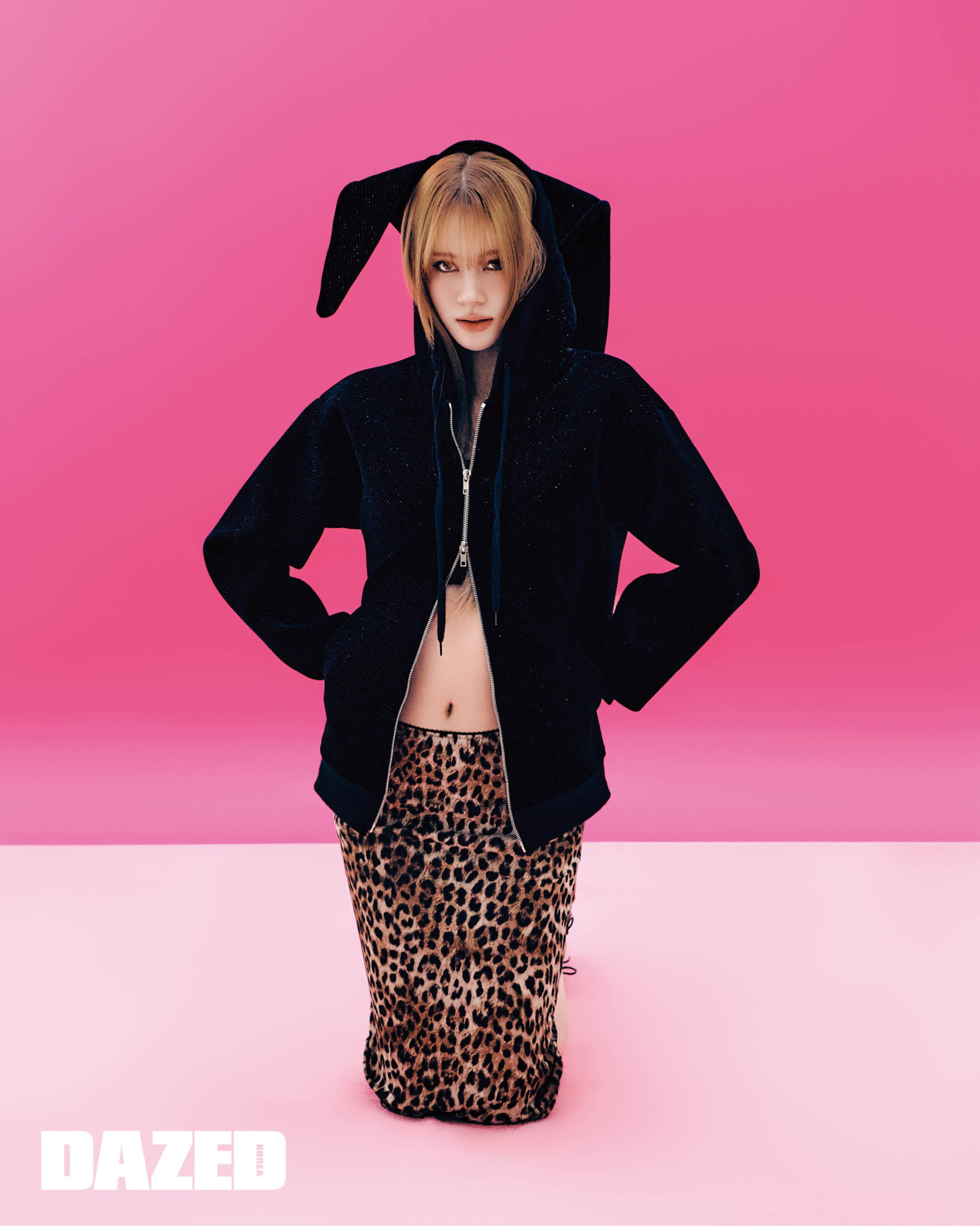 귀 디테일이 돋보이는 글리터 재킷은 푸시버튼(PushBUTTON), 레오퍼드 스커트는 엠에스지엠(MSGM), 리본 디테일 슈즈는 캠퍼랩(CAMPERLAB), 이너 톱은 에디터의 것.