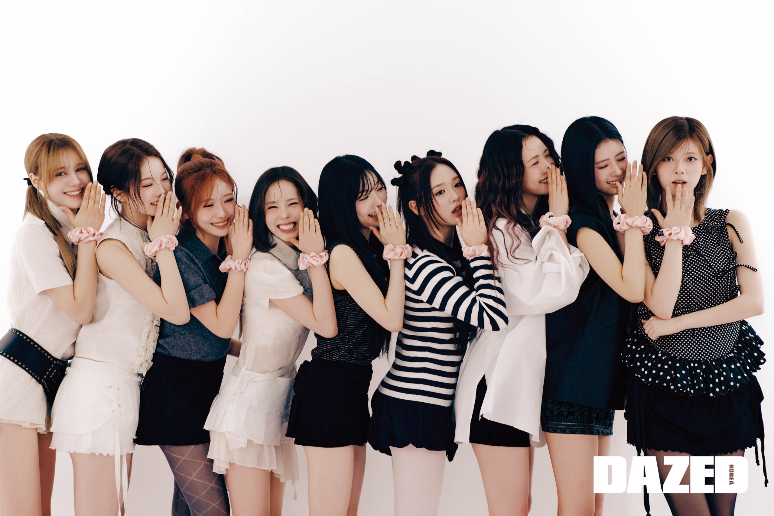 니나가 입은 버클 장식 셔츠는 버버리(Burberry), 플리츠스커트는 본네(Bonnae), 브레이슬릿으로 연출한 헤어 스크런치는 보르(Voor), 벨트는 샵사이다(Shop Cider). 아야카가 입은 프릴 디테일 슬리브리스 셔츠는 엠에스지엠(MSGM), 레이스업 디테일 스커트는 쓰리타임즈(Threetimes), 브레이슬릿으로 연출한 헤어 스크런치는 보르(Voor). 마유카가 입은 폴로 톱은 마르니(Marni), 스트랩 쇼츠는 나비버스(Naviverse), 브레이슬릿으로 연출한 헤어 스크런치는 보르(Voor), 아가일체크 패턴 타이츠는 로맨틱타이거(Romantic Tiger). 마코가 입은 로제타 베이비 셔츠는 스컬프터(Sculptor), 러플 슬리브리스 톱은 올세인츠(All Saints), 레이어링한 플리츠 랩스커트는 본네(Bonnae), 브레이슬릿으로 연출한 헤어 스크런치는 보르(Voor). 미이히가 입은 스트라이프 패턴의 슬리브리스 톱은 넘버투애니원(N21), 플리츠스커트는 본네(Bonnae), 브레이슬릿으로 연출한 헤어 스크런치는 보르(Voor). 리오가 입은 배색이 돋보이는 톱은 리바이스(Levi’s), 볼륨 쇼츠는 스컬프터(Sculptor), 브레이슬릿으로 연출한 헤어 스크런치는 보르(Voor), 타이츠는 에디터의 것. 마야가 입은 드레이핑 디테일 셔츠는 메종 마르지엘라(Maison Margiela), 니트 쇼츠는 롱샴(Longchamp), 브레이슬릿으로 연출한 헤어 스크런치는 보르(Voor). 리마가 입은 레더 소재의 슬리브리스 재킷은 올세인츠(All Saints), 트위드 소재의 쇼츠는 헤티(Hetit), 브레이슬릿으로 연출한 헤어 스크런치는 보르(Voor). 리쿠가 입은 도트 패턴 슬리브리스 프릴 톱은 비뮈에트(Bmuet(te)), 레이스업 디테일 스커트는 쓰리타임즈(Threetimes), 브레이슬릿으로 연출한 헤어 스크런치는 보르(Voor), 타이츠는 에디터의 것.