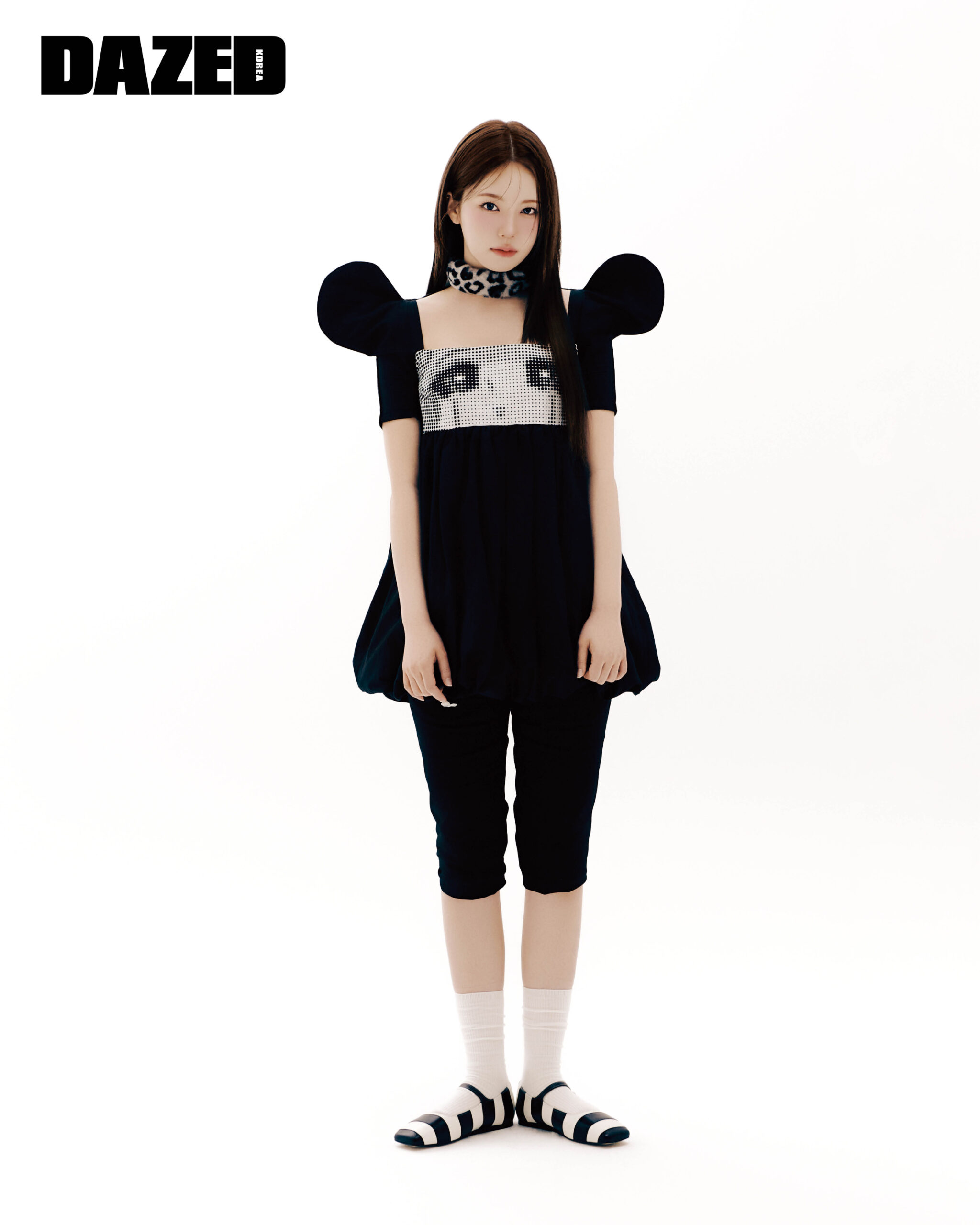 퍼프 숄더가 돋보이는 그래픽 볼륨 드레스는 푸시버튼(PushBUTTON), 미디 팬츠는 엠에스지엠(MSGM), 배색이 돋보이는 플랫슈즈는 잉크(EENK), 퍼 소재의 초커는 에이레브(Eireve), 이어링은 아야카의 것, 삭스는 에디터의 것.