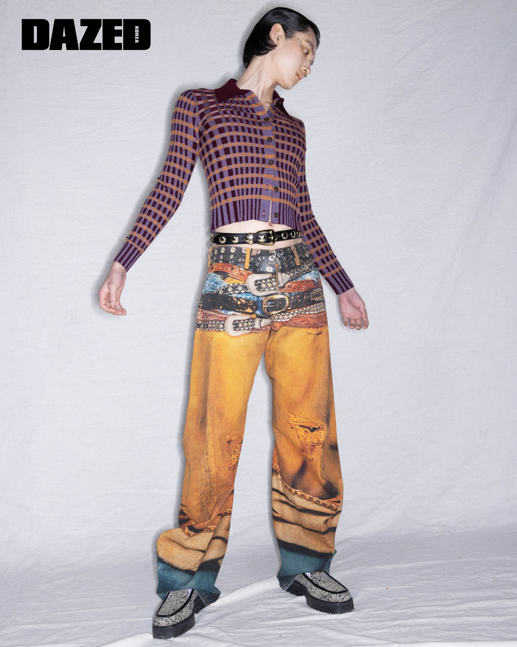 멀티컬러 니트 카디건은 메종 키츠네(Maison Kitsune), 프린트 팬츠는 아크네 스튜디오(Acne Studios), 로퍼는 어네스트 W. 베이커 by 10 꼬르소 꼬모 서울(Ernest W. Baker by 10 Corso Como Seoul), 노즈 링은 발렌티노 가라바니(Valentino Garavani), 스터드 벨트는 케이트(Khaite).