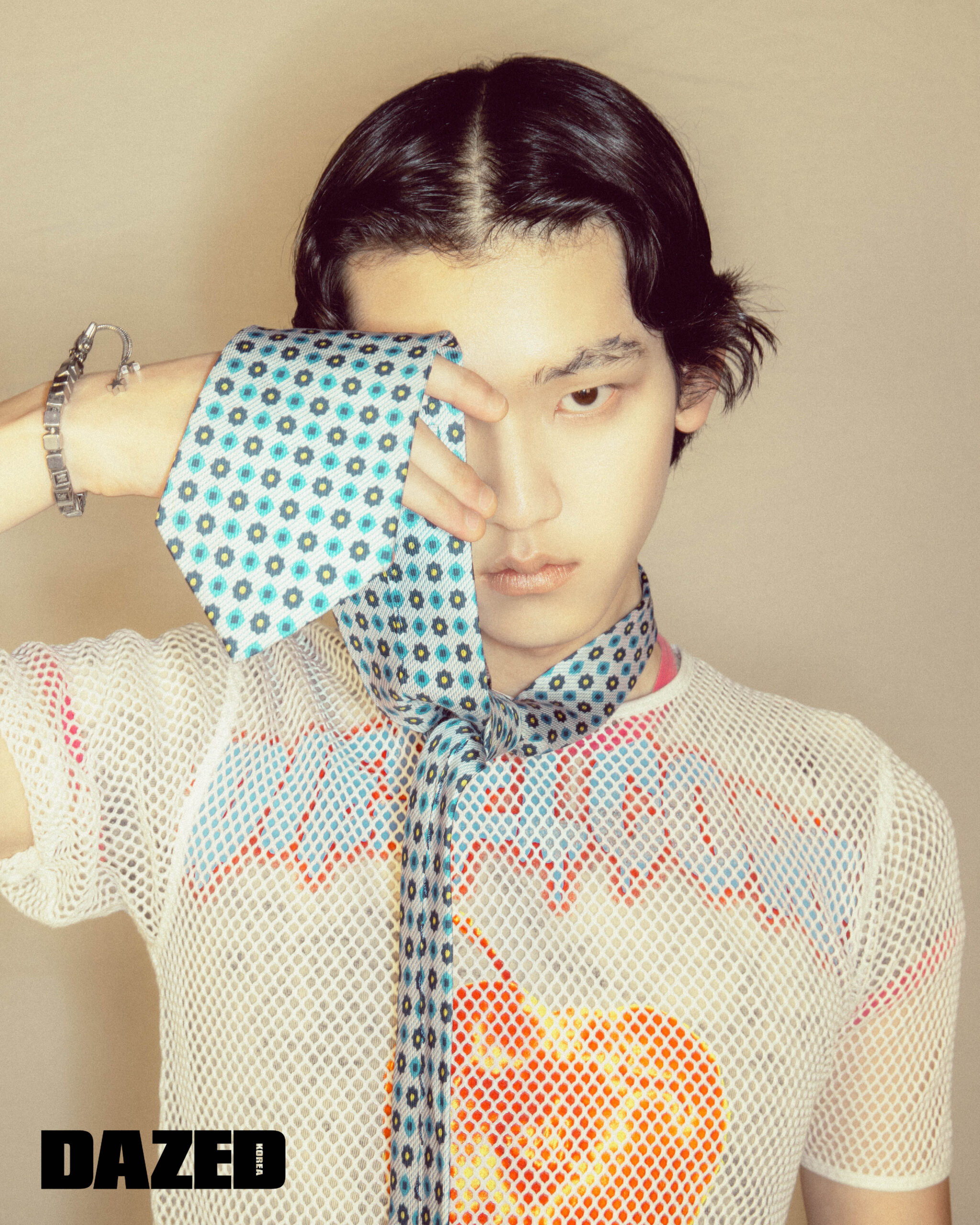 메시 티셔츠는 발리(Bally), 이너로 입은 그래픽 프린트 톱은 디젤(Diesel), 타이와 브레이슬릿은 에디터의 것.