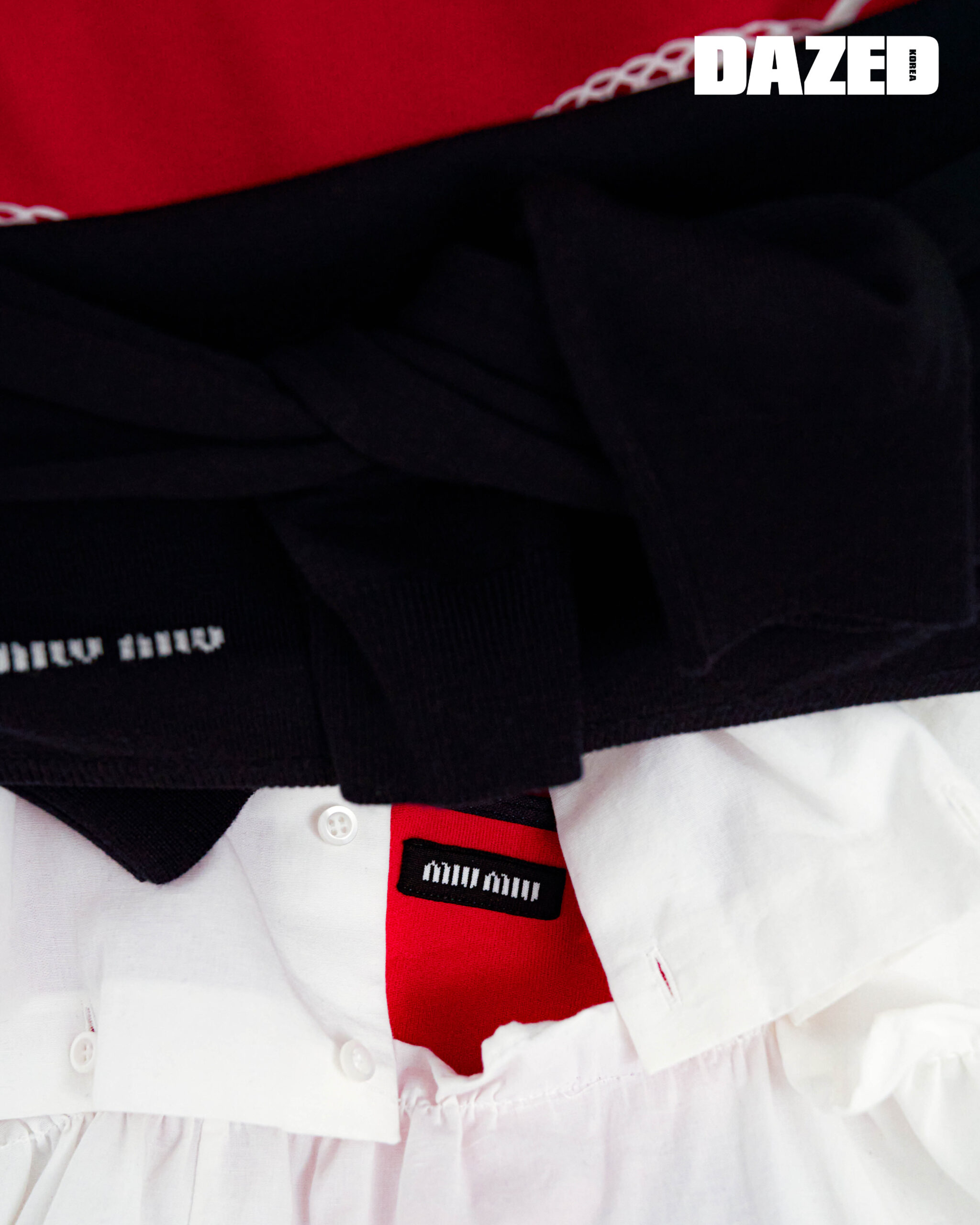레드 나일론 보디슈트와 화이트 포플린 드레스, 네이비 울 니트 톱은 모두 미우미우(Miu Miu).