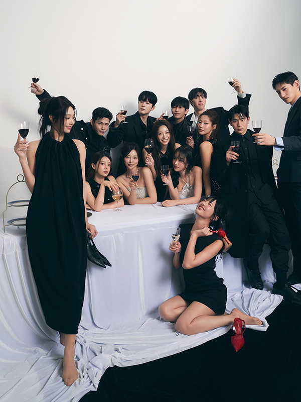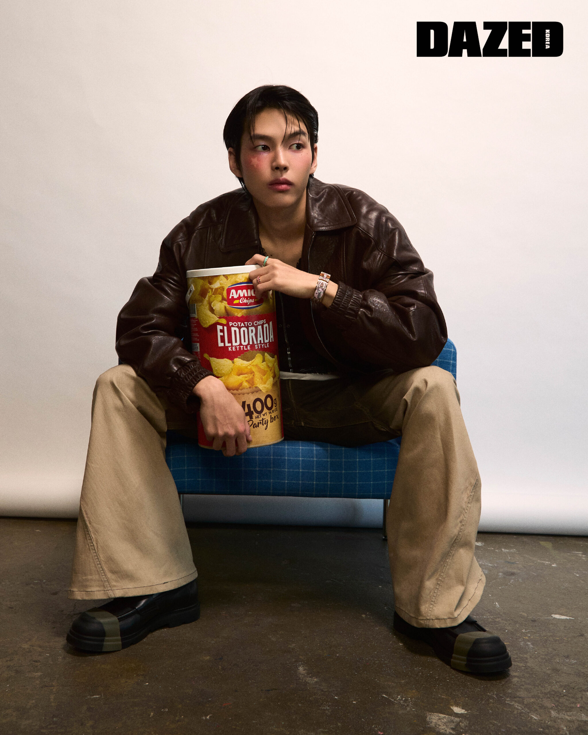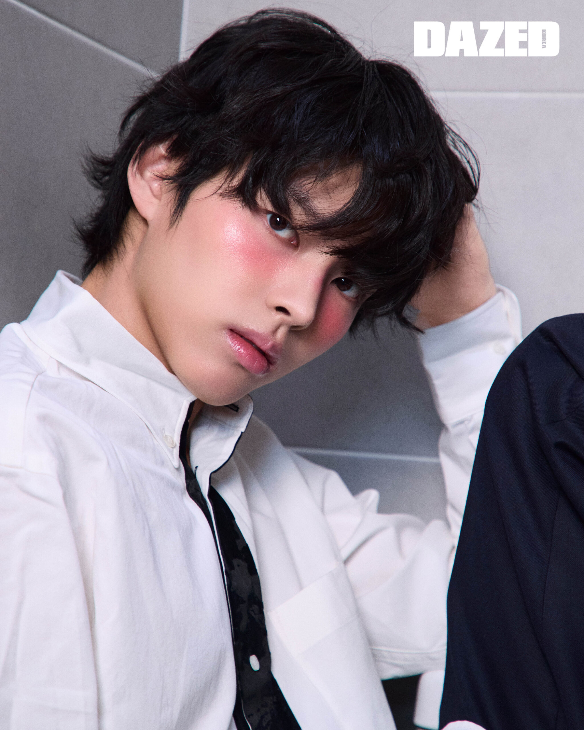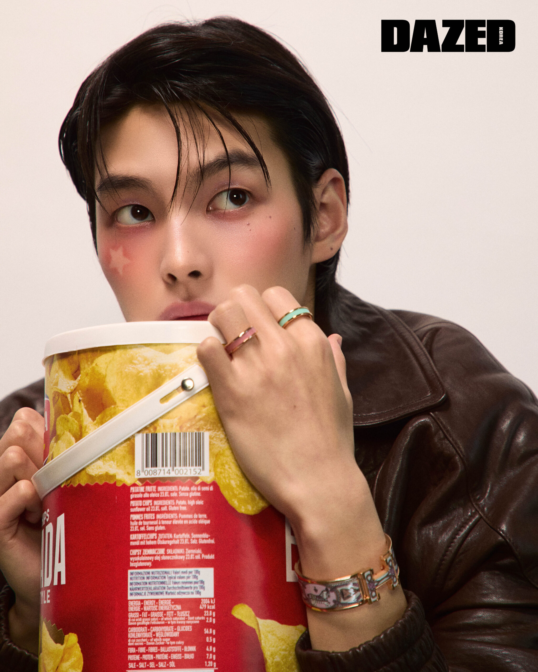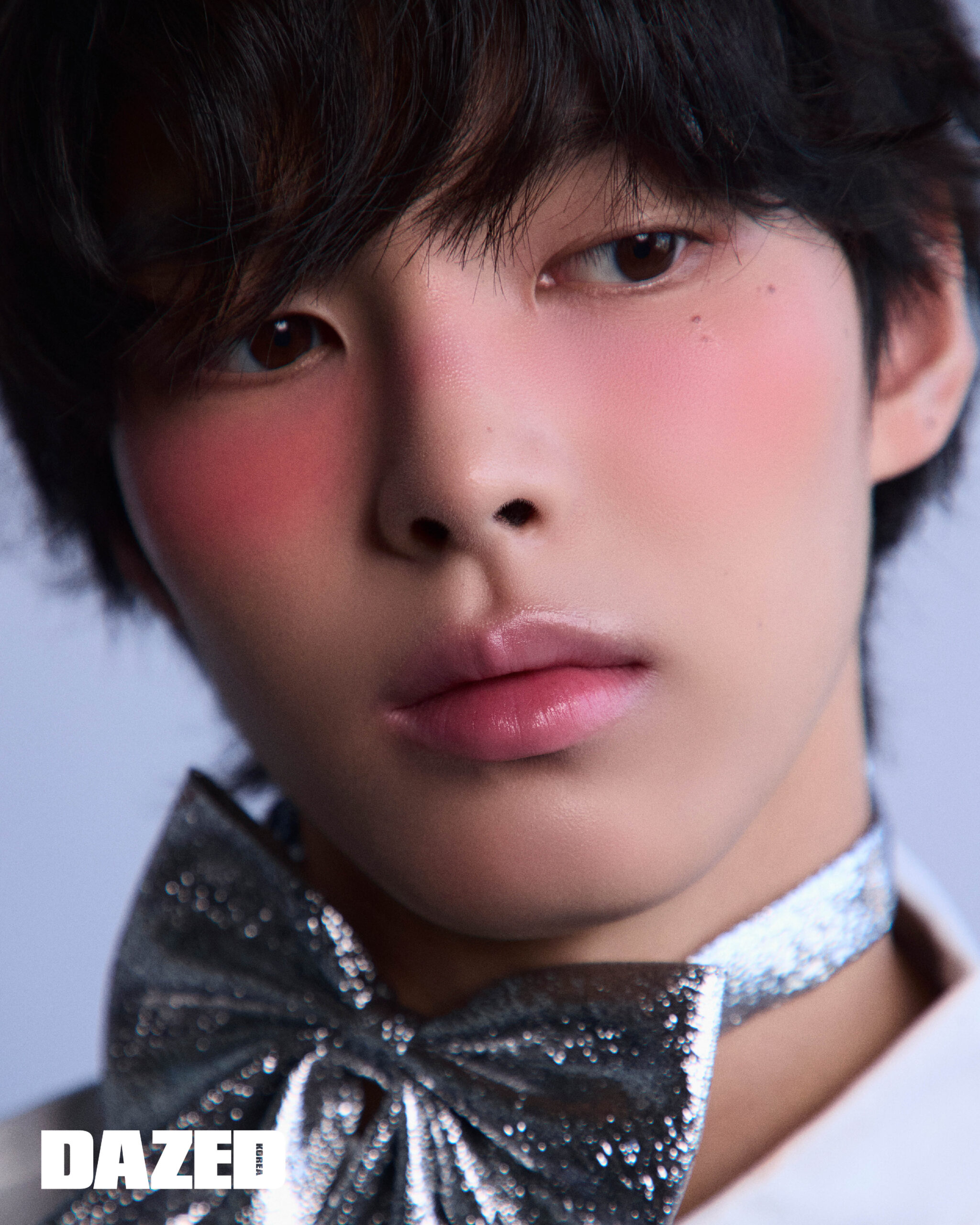 감자칩 통을 들고 어딘가 바라보던 그. 결국 촬영 도중 감자칩을 꺼내 먹더라. 별 모양 스티커를 붙이고 실키한 텍스처의 화사한 소프트 베이비 핑크 컬러 블러셔로 스티커 주변을 블렌딩한다.