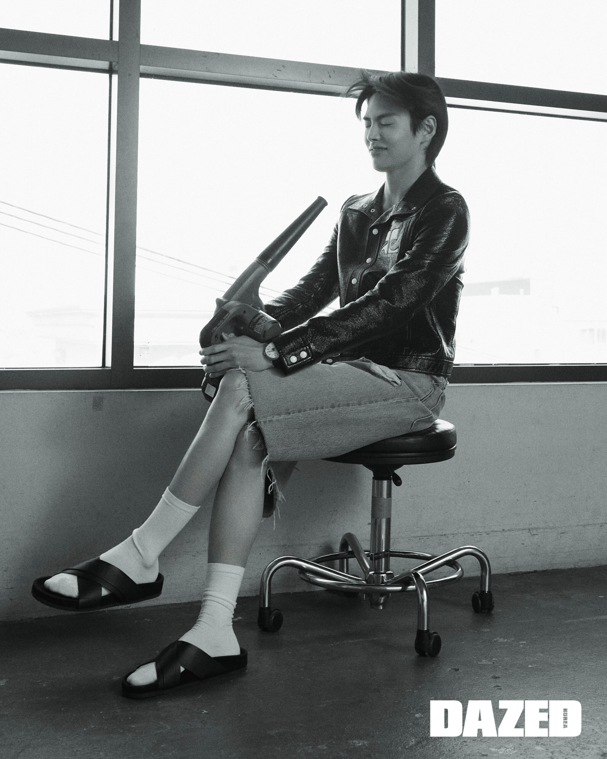 레더 재킷은 헌킴(Heon Kim), 슈즈는 캠퍼(Camper), 브레이슬릿과 왼손 검지와 약지에 착용한 링은 모두 에르메스(Hermès), 팬츠는 에디터의 것.