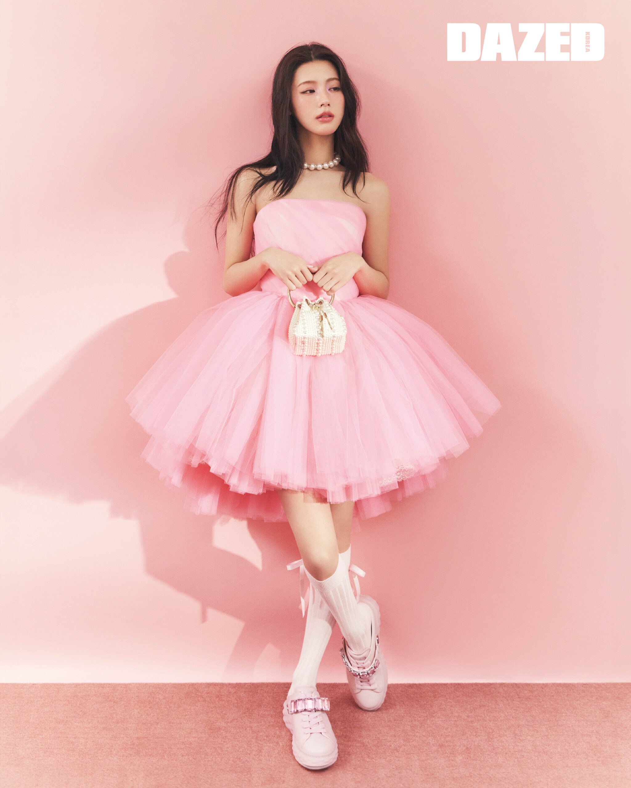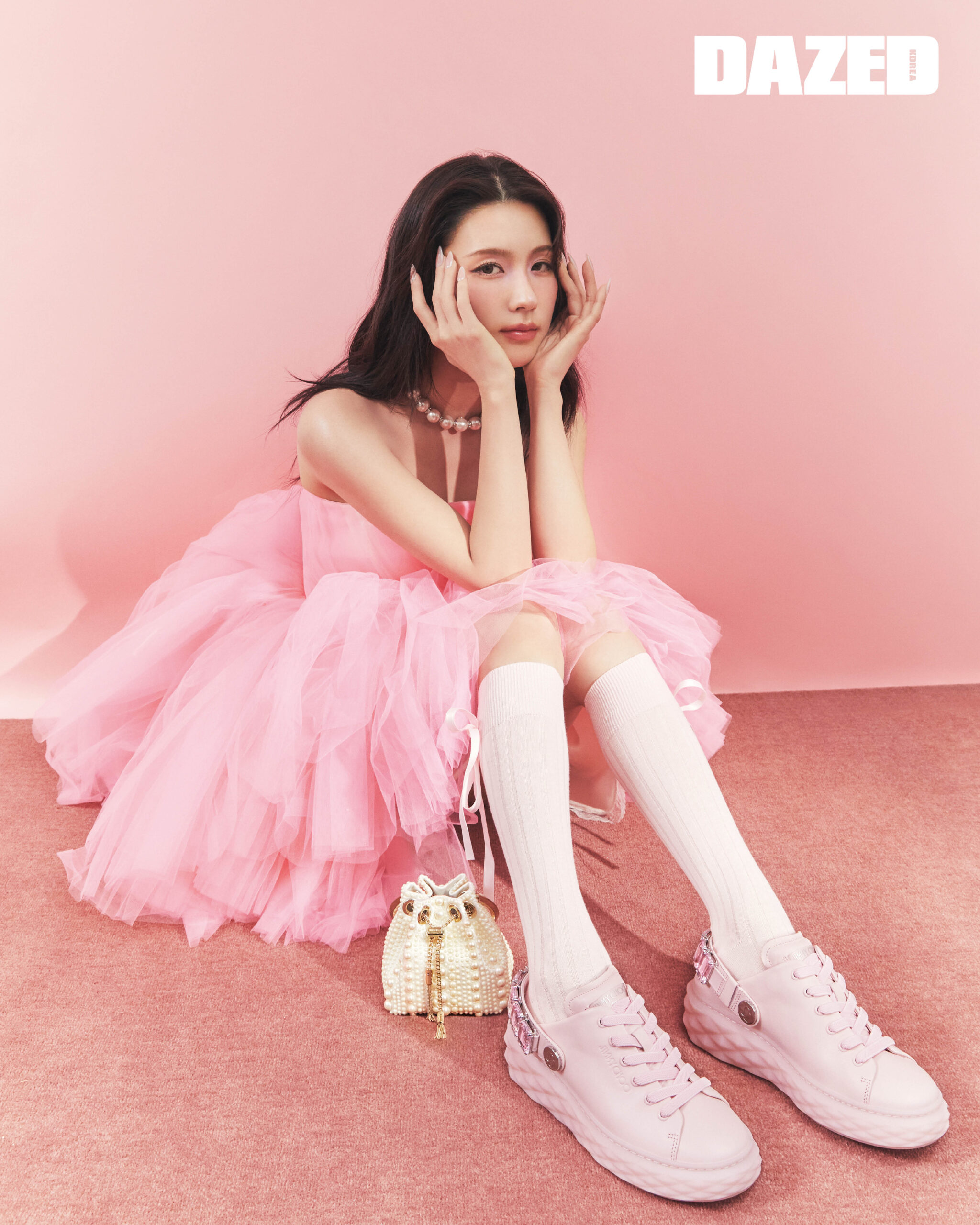 파우더 핑크 컬러 다이아몬드 슬링 스니커즈와 펄 크리스털 초커, 펄 장식의 봉봉 백은 모두 지미추(Jimmy Choo), 시폰 드레스는 제이핑크(Jpink), 삭스는 스타일리스트의 것.