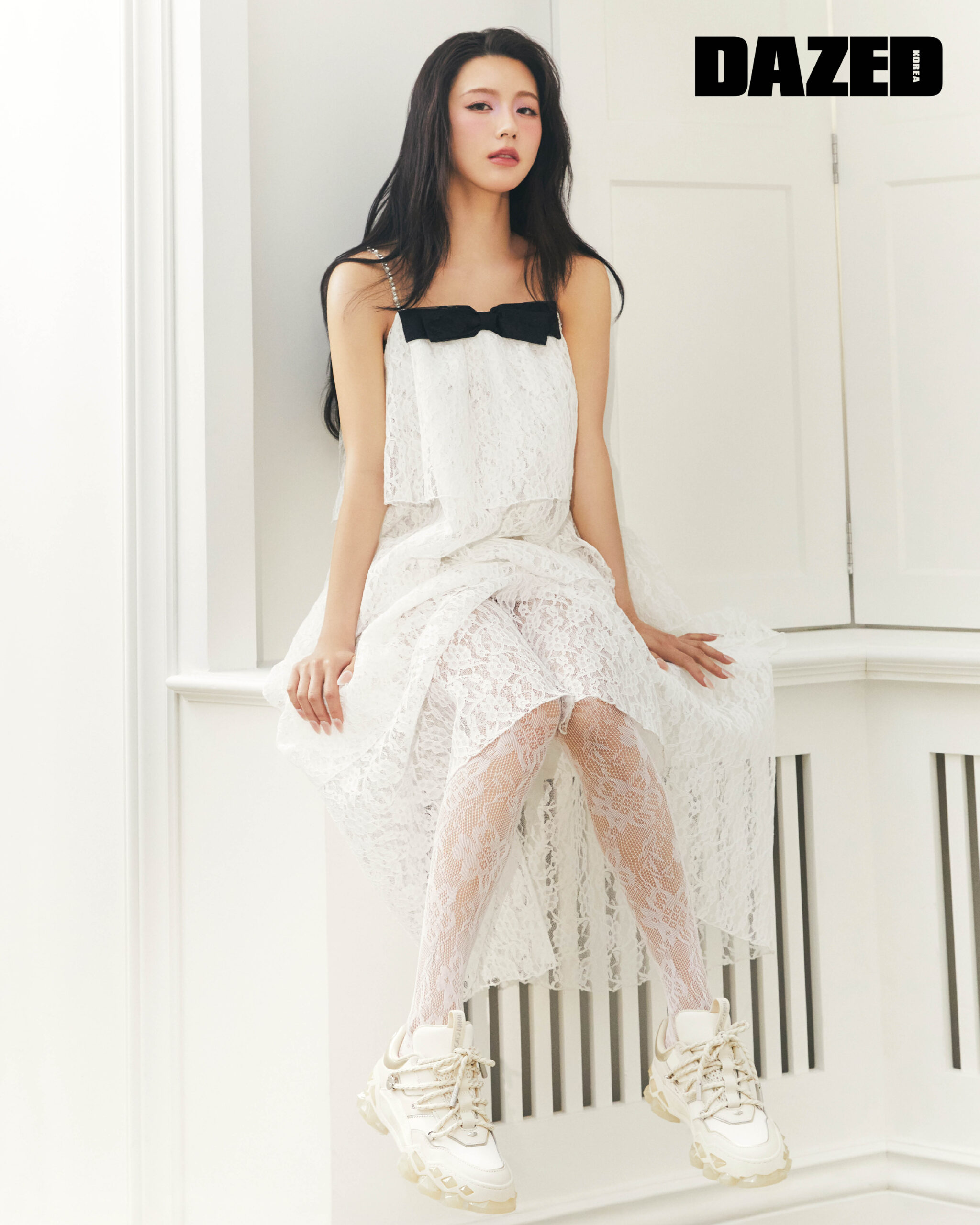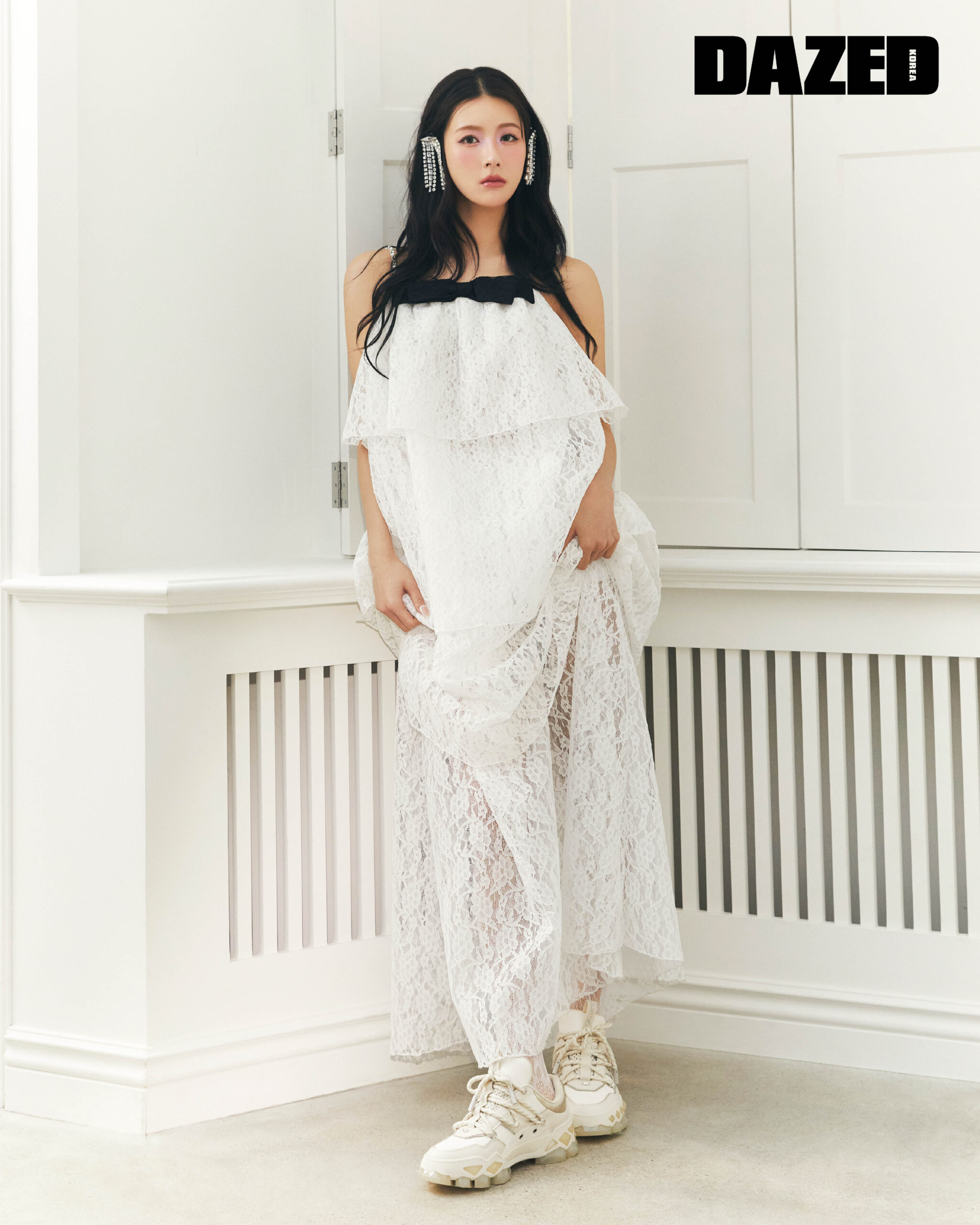 다이아몬드 X II F 스니커즈는 지미추(Jimmy Choo), 레이스 드레스는 가니송(Ganisong), 타이츠는 스타일리스트의 것.