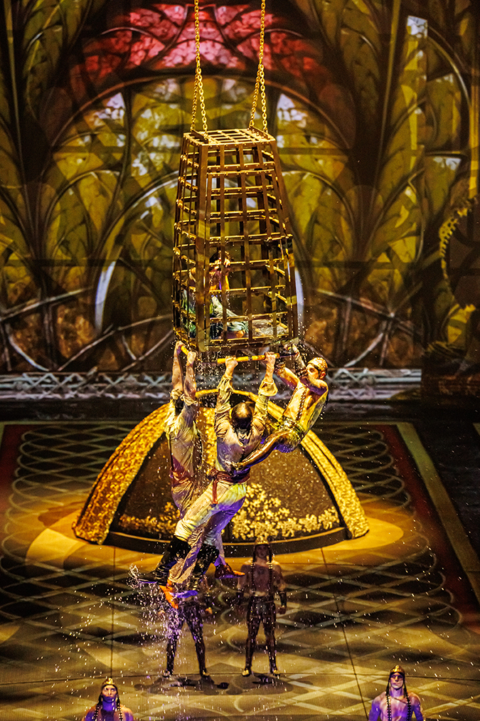 <하우스 오브 댄싱 워터> 공연 중 빙글빙글 도는 구조물에서 출연진이 기상천외한 몸동작으로 온갖 곡예를 펼친다.