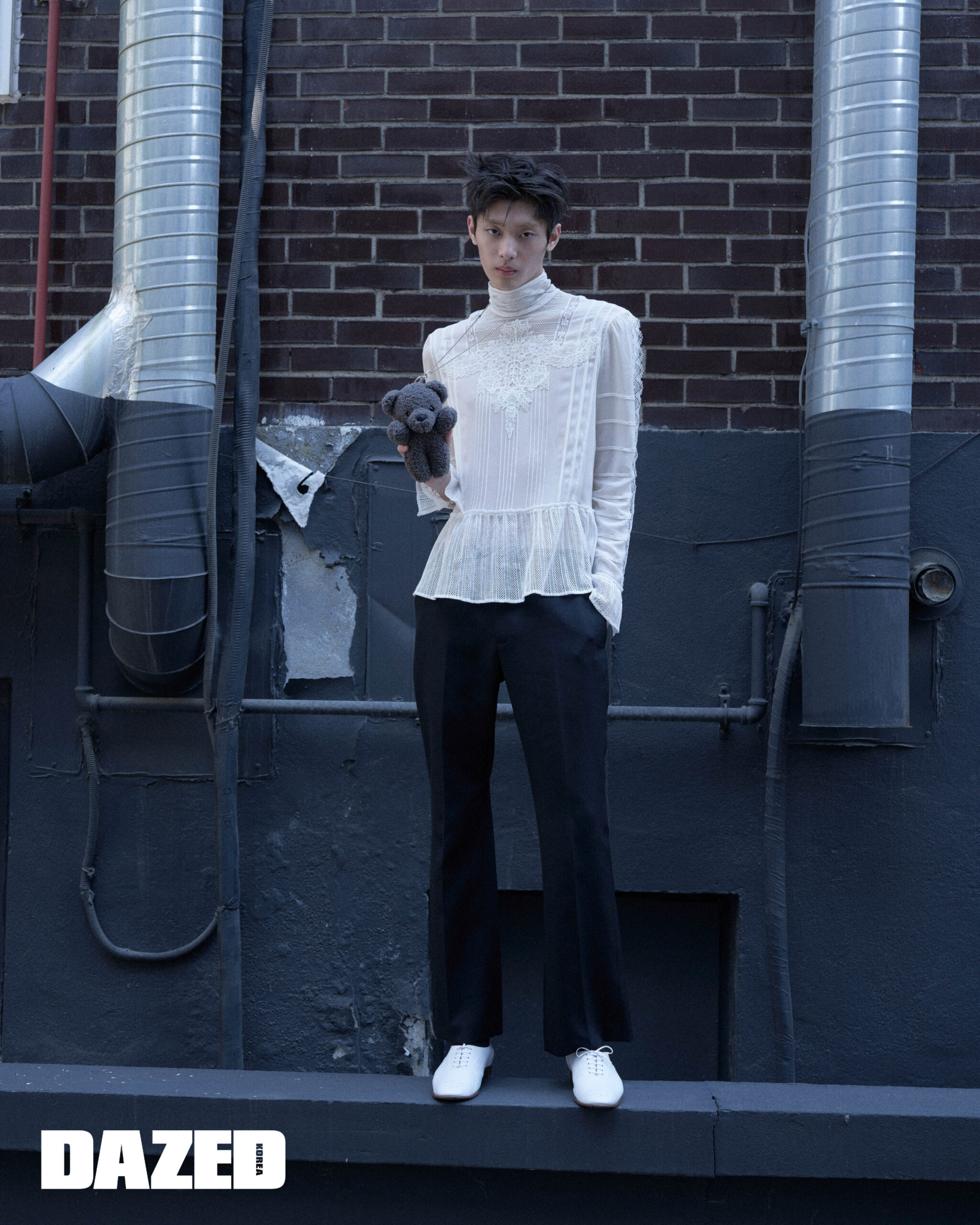 화이트 레이스 셔츠와 팬츠는 맥퀸(McQueen), 화이트 로퍼는 셀린느(Celine), 테디베어 키체인 키링은 바퀘라(Vaquera).