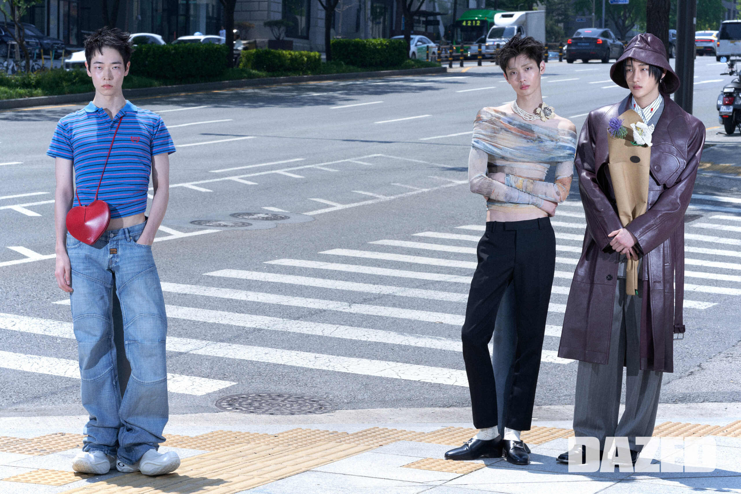 료타가 입은 폴로셔츠와 로웨이스트 팬츠, 슈즈는 모두 발렌시아가(Balenciaga), 하트 모양 크로스백은 알라이아(ALAÏA). 밍하오가 입은 메시 소재의 오프숄더 톱은 크리스토퍼 에스버 by 아데쿠베(Christopher Esber by Adekuver), 팬츠와 로퍼는 맥퀸(McQueen), 플뢰르 루미너스 네크리스와 삭스는 발렌티노 가라바니(Valentino Garavani). 하민이 입은 물고기 모양 칼라 포인트가 돋보이는 나파 레더 코트, 스트라이프 패턴의 멜란지 울 재킷과 트라우저 셋업, 핀스트라이프 포플린 셔츠, 마르첼로 로퍼, 나파 레더 소재의 버킷 해트, 카프스킨 소재의 레더 크로셰 플라워는 모두 보테가 베네타(Bottega Veneta), 이어링은 하민의 것